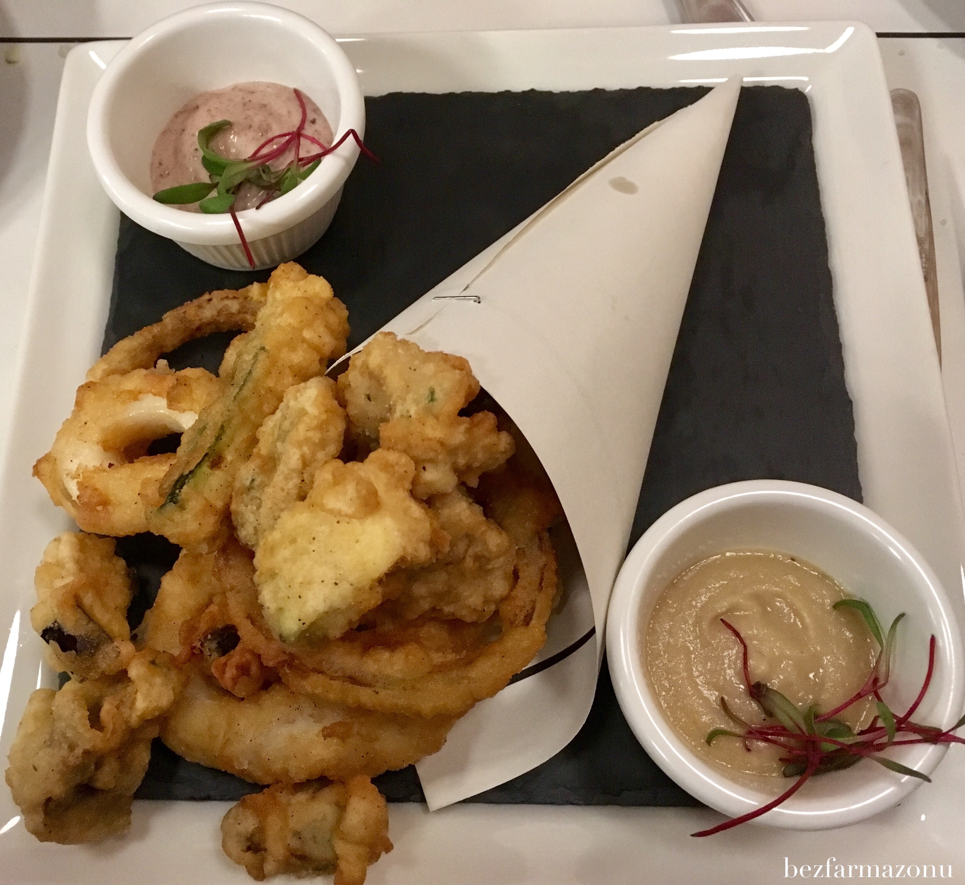 - owoce morza i warzywa w tempurze wraz z majonezem oliwkowym oraz salsą z cebuli (34 PLN): omułki, kalmary i krewetki w cieście pachniały tak mocno, że najmłodszy towarzysz kolacji nie mógł znieść tego zapachu. Dodatkowe niechemiczne sosy intensyfikowały doznania i całość szybko zniknęła z tacy przyjaciela W.