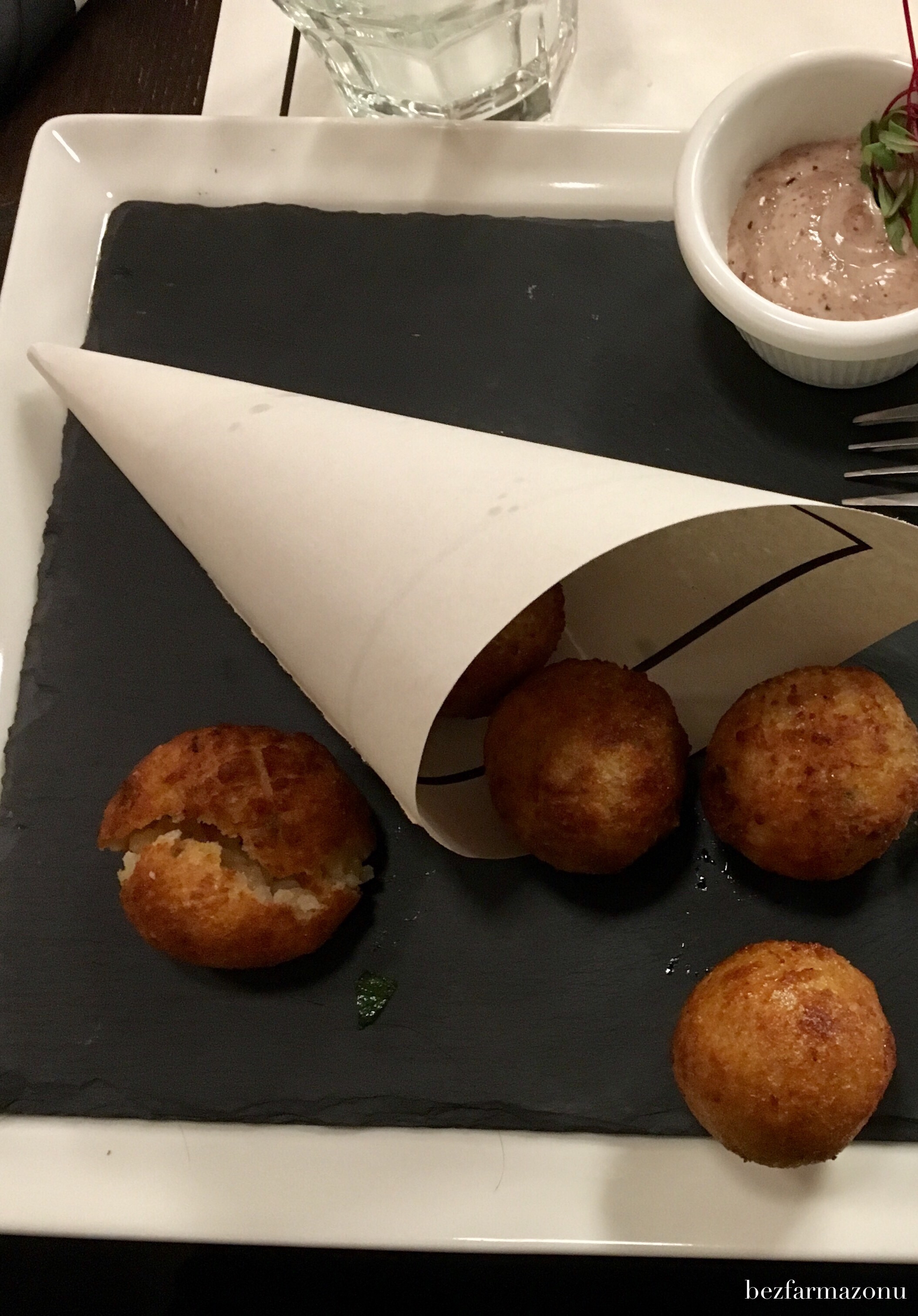 - smażone kulki ryżowe nadziewane włoską kiełbasą – 5 albo 6 sztuk w cenie 28 złotych – danie było w porządku, ale niczym nie zaskoczyło. Ot uformowane i usmażone w głębokim oleju kulki wielkości piłeczki pingpongowej podane z majonezem z włoskich oliwek;