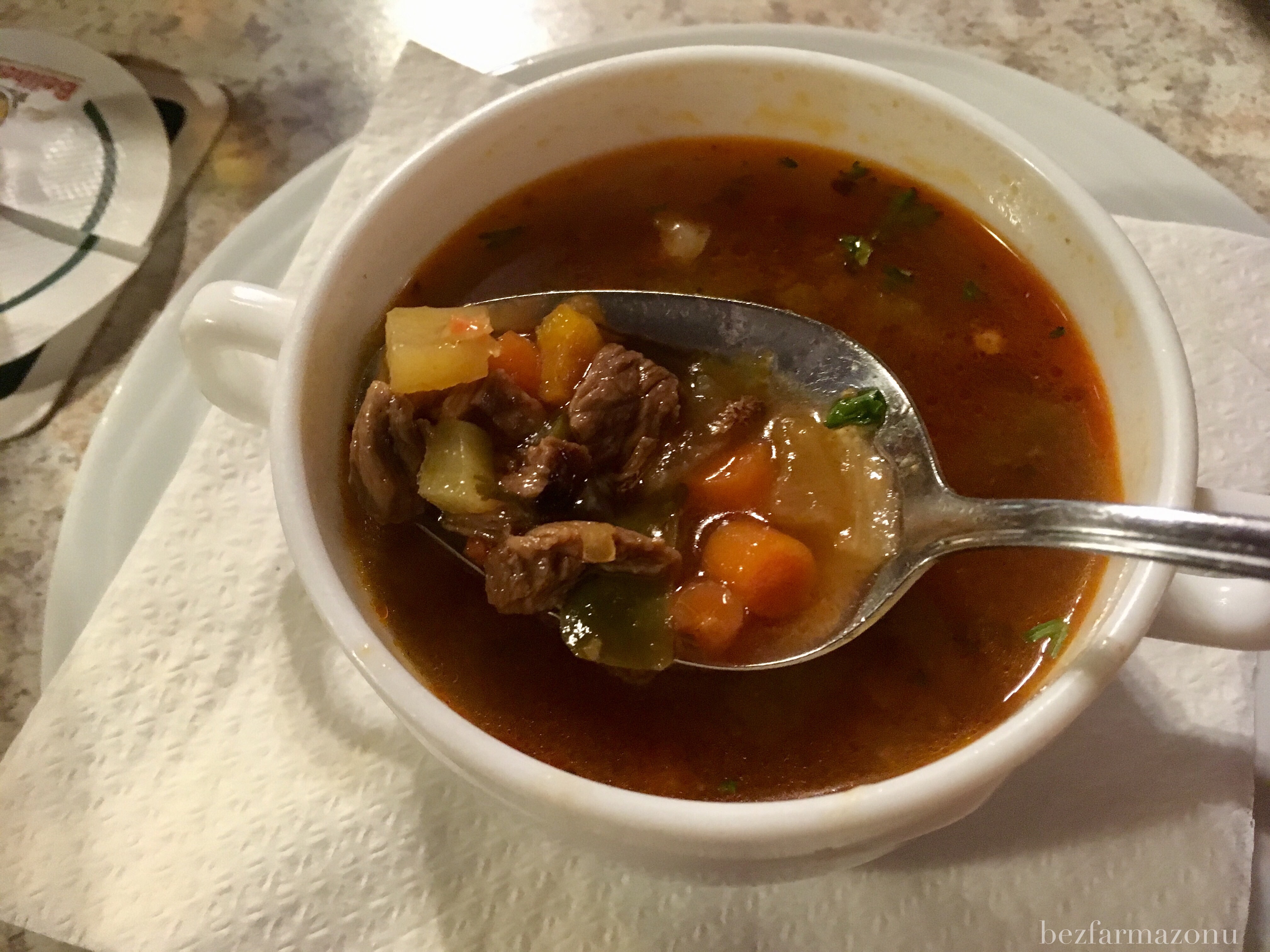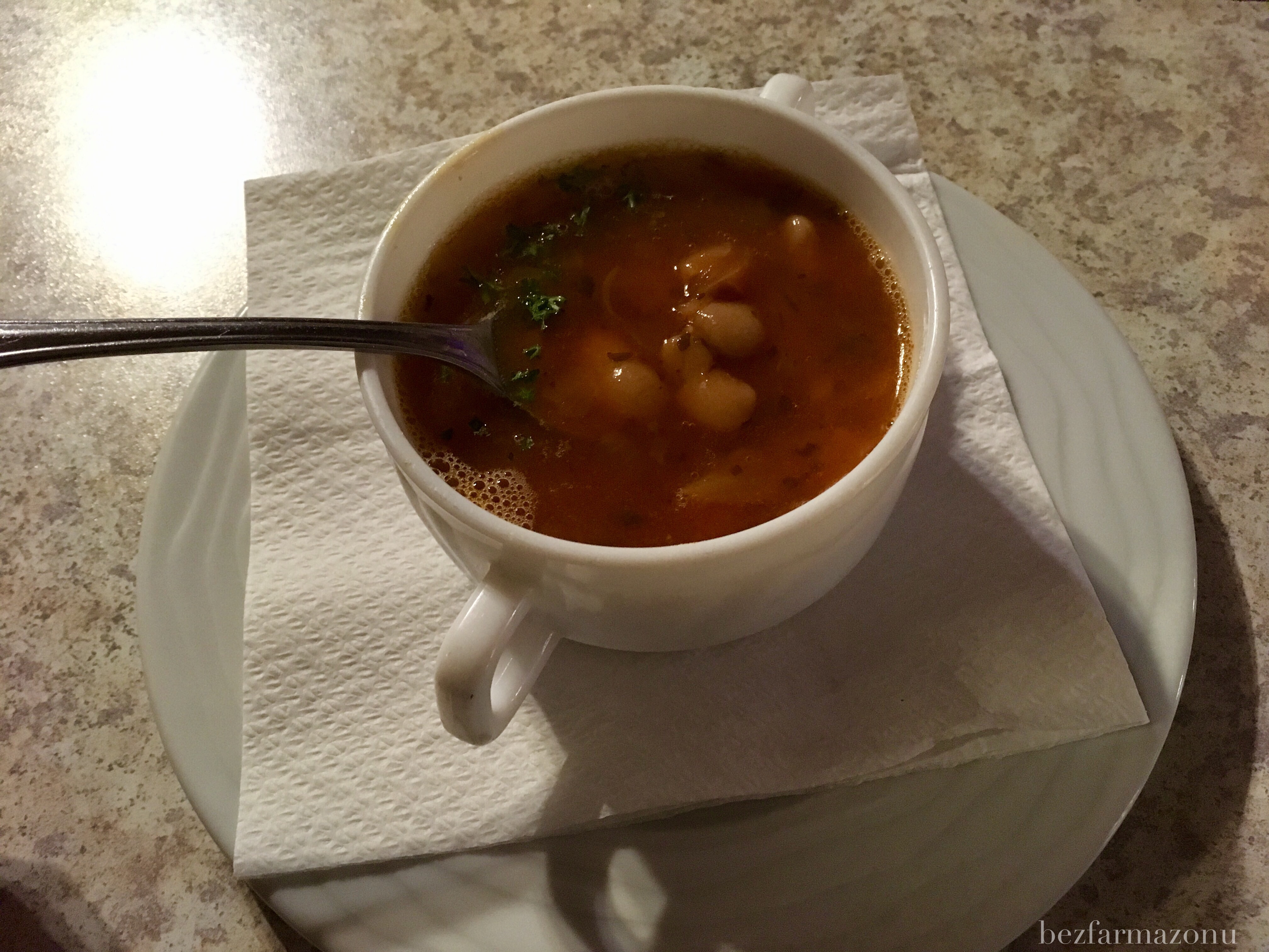 Grochowa oraz gulaszowa (każda 3.50 Euro) pojawiły się po około 15 minutach – trochę długo jak na polewki. Obydwie gorące, podane w małych miseczkach. Fasolowa oprócz grochu miała kilka kawałków kiełbasy oraz boczku. Gulaszowa była rzadka, małomięsna, bez fajerwerków.