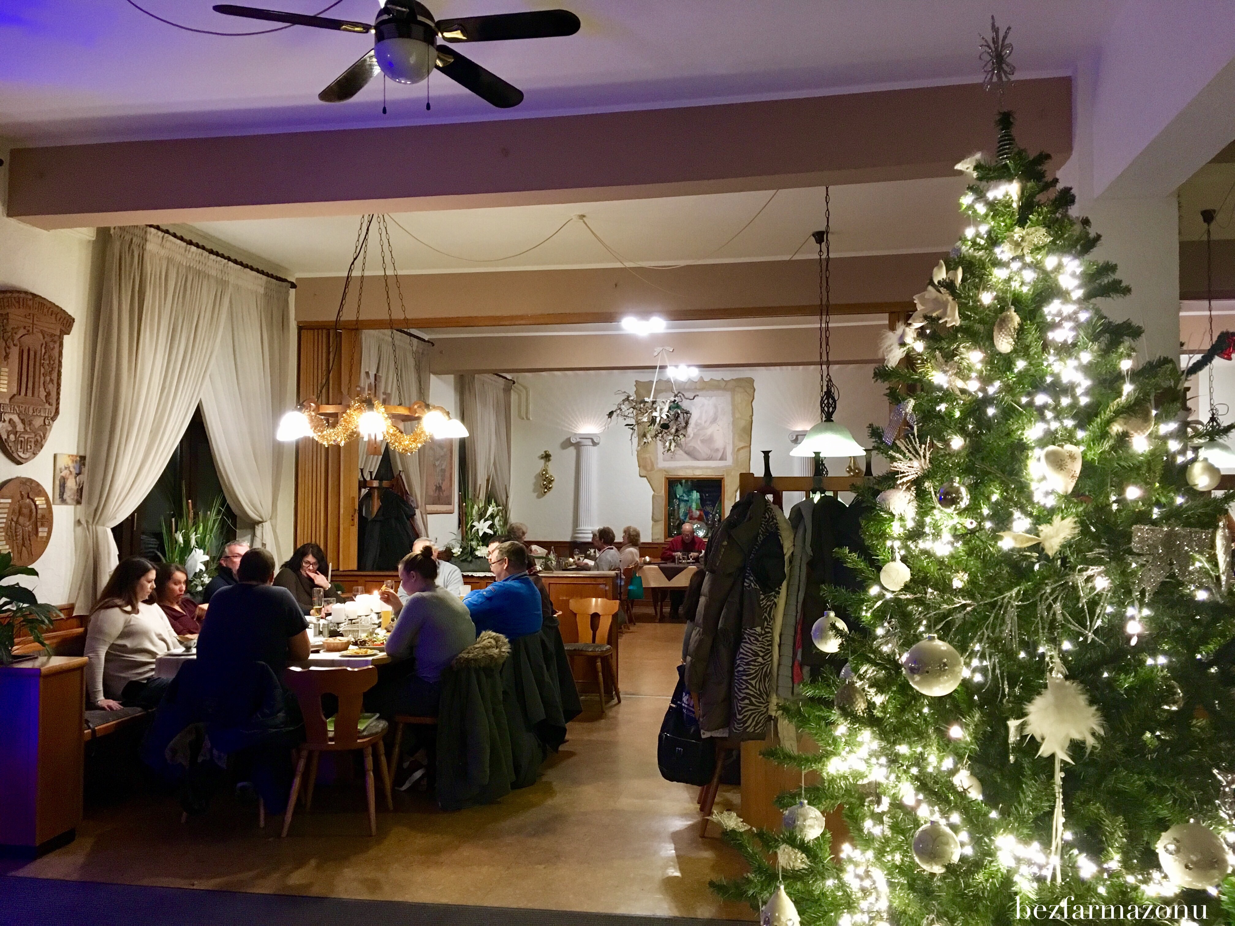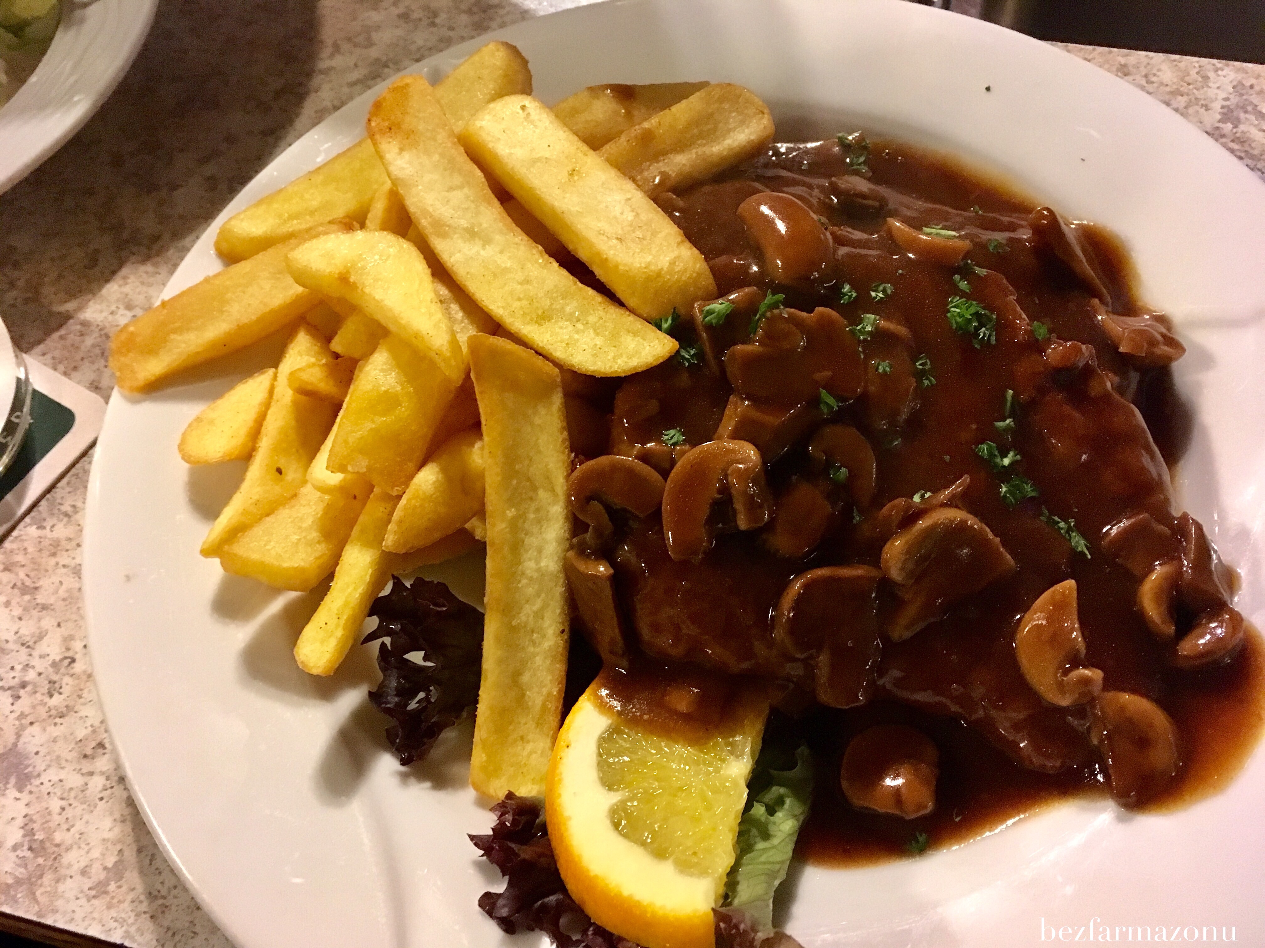 W. zamówił Jagerschnitzel (11 Euro) – wieprzowy, panierowany kotlet polany dużą ilością zdecydowanie zbyt słonego sosu z pieczarkami. W zestawie chrupiące frytki – całość taka sobie.