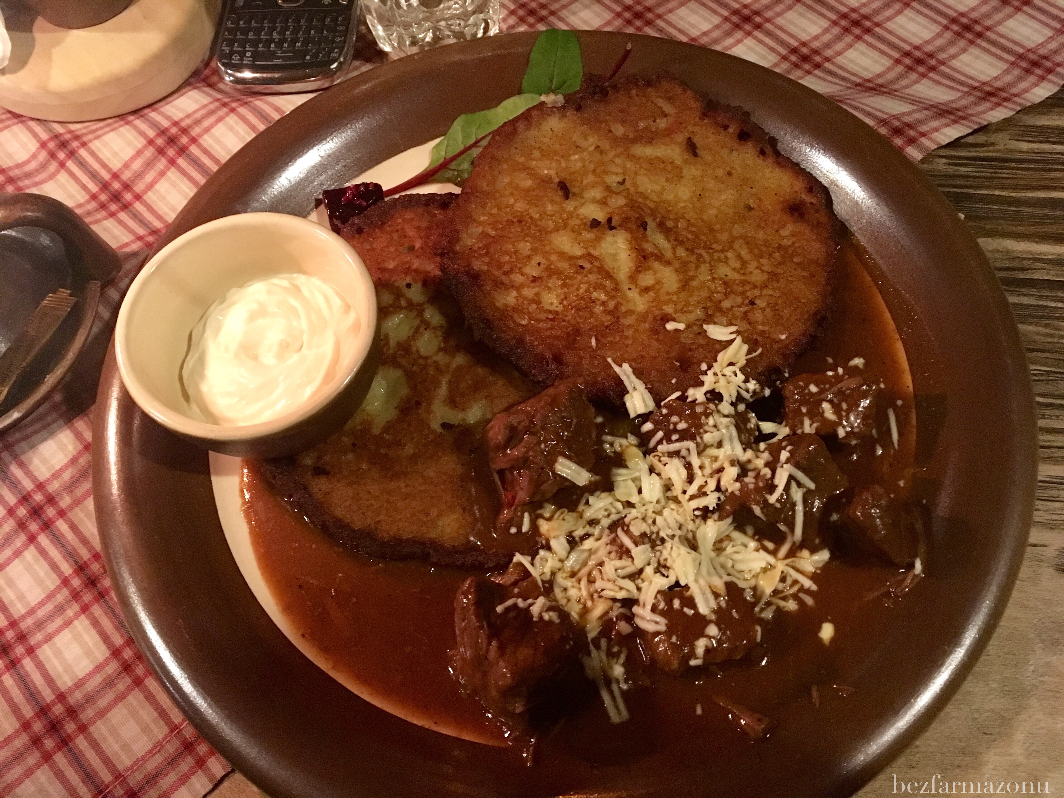 Sz. zamówił placek po zbójnicku z gulaszem i startym oscypkiem. Stwierdził iż porcja była trochę za mała jak na 29PLN – chudego wołowego mięsa nie było więcej niż 100g. Placki dobrze starte i usmażone tak jak trzeba.