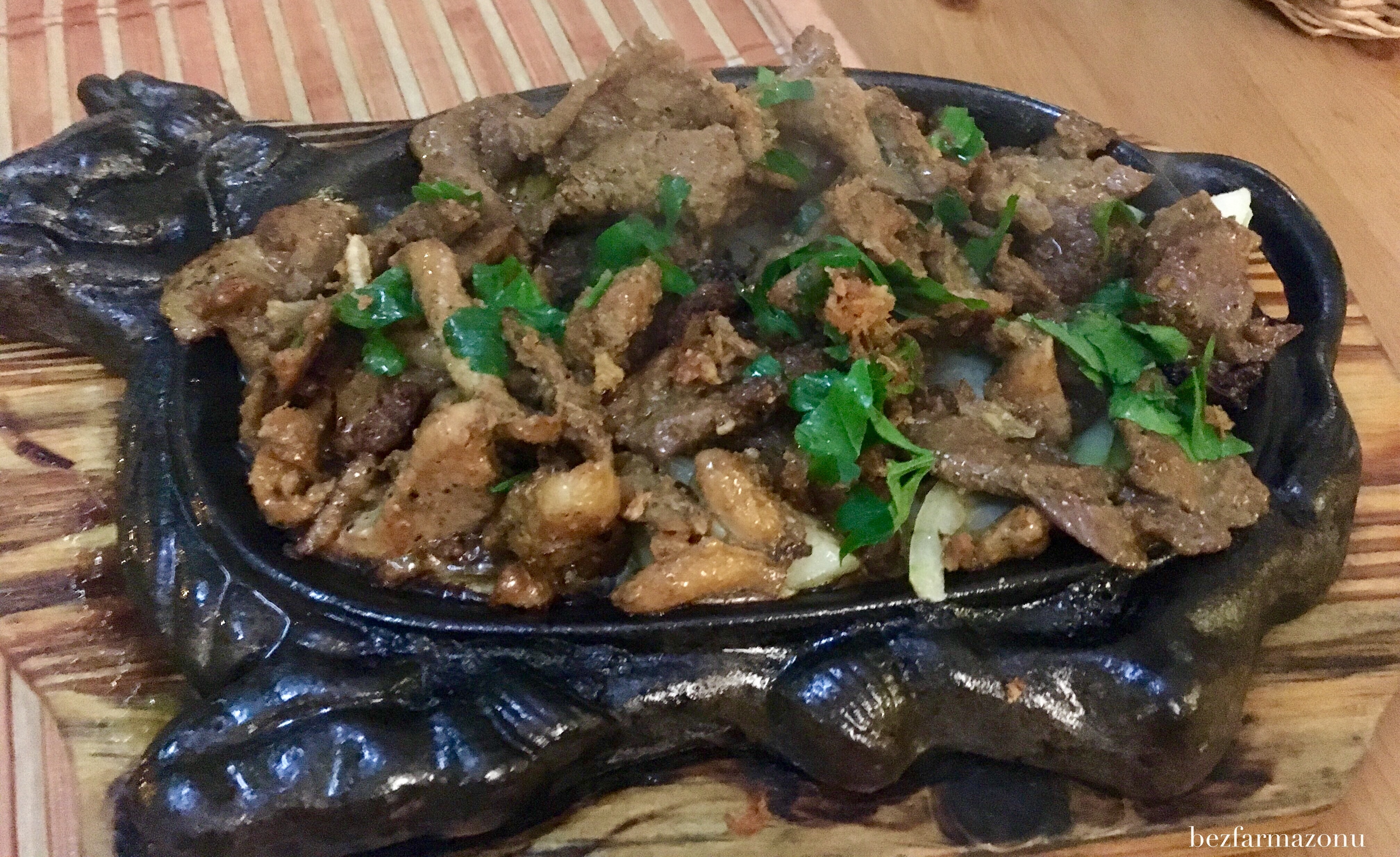 Porcja składała się z 4 kawałków cienko rozbitego, soczystego fileta (na oko jakieś 250g). Pod spodem skwierczała cebulka. Łatwo się kroił, ale przesadzono z przyprawami przez co jak dla mnie był zbyt słony. Dzięki gorącemu półmiskowi utrzymał wysoką temperaturę do ostatniego kęsa. Następnym razem muszę pamiętać aby poprosić o mniej przypraw i będzie git.