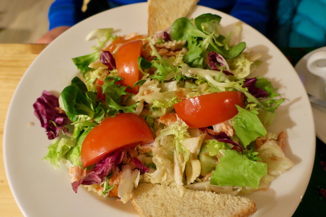 - duża sałatka z łososiem (21 PLN). P. chciał coś lekkiego. Na zdjęciu tego nie widać, ale sałatka miała pod zieleniną OGROMNĄ ilość łososia. Do tego dwie chrupiące kromki pszennego tosta. Smakowo bez rewelacji.