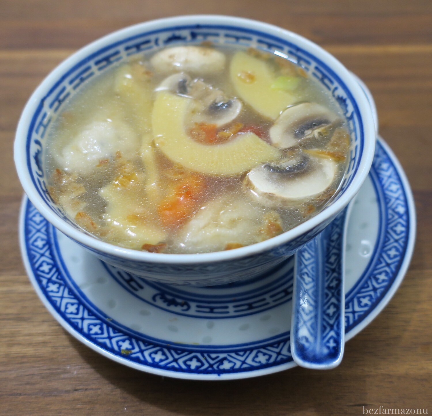 - bardzo gorący półmisek zupy (ok 300ml) zawierał w sobie pyszne warzywka i kilka mini pierożków z mięsem z kurczaka. Dodatkowo pływały w niej minimalne płatki podsmażonej cebulki co nadawało zupie zajebistego posmaku. Mimo, iż na stole były różne sosy i przyprawy nie dodałem ani kropli/szczypty czegokolwiek, gdyż nie było takiej potrzeby. Takich zup życzę sobie w Polsce!