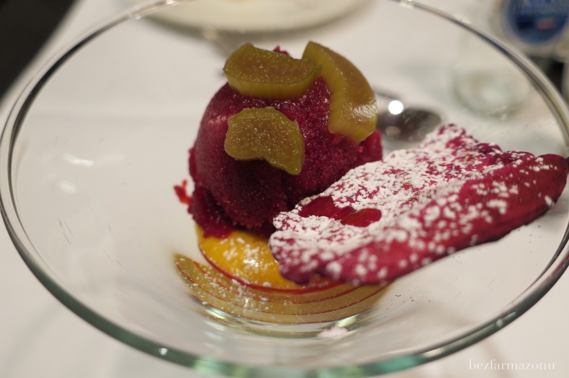 Sorbet  był iście nietypowy. Słodki na swój sposób burak dobrze komponował się z minimalnie kwaskowatym rabarbarem. Na samym spodzie naczynia spoczywał przyjemny mus mandarynkowy. Miłym dodatkiem był czips z prawdopodobnie jakiegoś kwiatka (a może też z buraka?). Deser finezyjny i  z pomysłem.