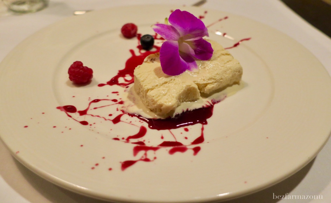 Lody o zdecydowanym orzechowym smaku wraz z małymi  kawałkami nugatów na jednej ściance były zwieńczeniem wieczoru. W sam raz słodkie i minimalnie rozpuszczone zniknęły w oka mgnieniu. Jadalny kwiat był giętki i świeżutki.