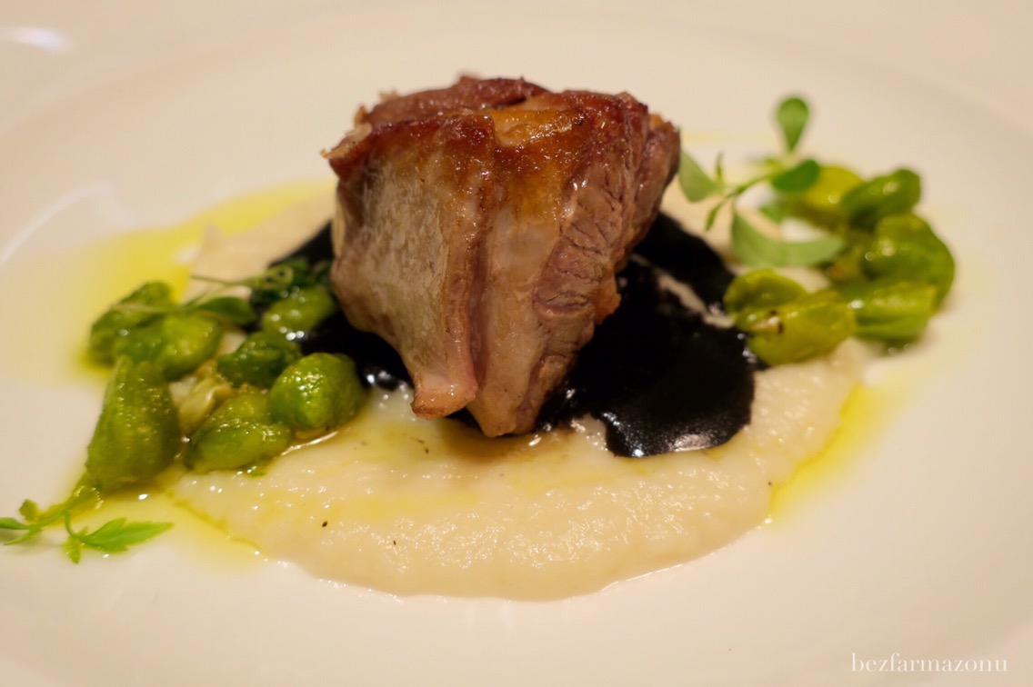 • biodrówka jagnięca po której spodziewałem się soczystości i ogólnej wspaniałości okazała się katastrofalna. Mały około 100g kawałek był tłusty i miejscami twardawy – 1/3 nie dało się zjeść – zresztą widać na zdjęciu poniżej. Czy tak powinna wyglądać soczysta biodrówka? Tragedia :/  Pure z wężymorda (nie to nie jest ryba jakby się wydawało – jest to warzywo nazywane również czarnym korzeniem lub skorzonerą) wraz z sosem z bakłażana fajnie współgrały, jak dla mnie były jednak odrobinę za słone. Najlepszy z całego zestawu był młody bób. Oliwa koprowa również niczego sobie. (Dopiska z 28 kwietnia 2017: kolega z pracy był również w Qualicie w ramach Restaurant Week i dostał super soczysty kawałek mięska, pisał też, że całkowicie inaczej wyglądał niż ta paść, którą dostałem ja – czyli po prostu miałem pecha)
