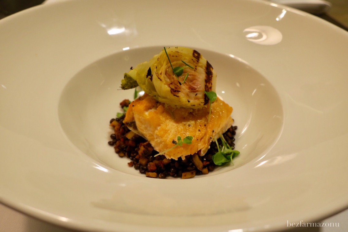 • konfitowana w maśle rakowym ryba była delikatna i niewysuszona, smakowała poprawnie. Jak fanem soczewicy nie jestem, tak jej odmiana – czarna beluga trafiła w mój gust i wraz z warzywkami bardzo dobrze pasowała do rybnego drapieżnika jakim jest łosoś. Grillowana kapusta okazała się wybornym i prostym dodatkiem. To co mnie zdziwiło to podanie powyższego zestawu w głebokim talerzu. Kimkolwiek był pomysłodawca, nie jadł On tej kombinacji z takiego naczynia. Było to przejście przez mękę. Operowanie sztućcami trzymając je niemalże w pionie i próby nałożenia w ten sposób sypkich składników na widelec były bardzo nieefektywne – skończyło się na wyjadaniu łyżką węglowodanowych dodatków.