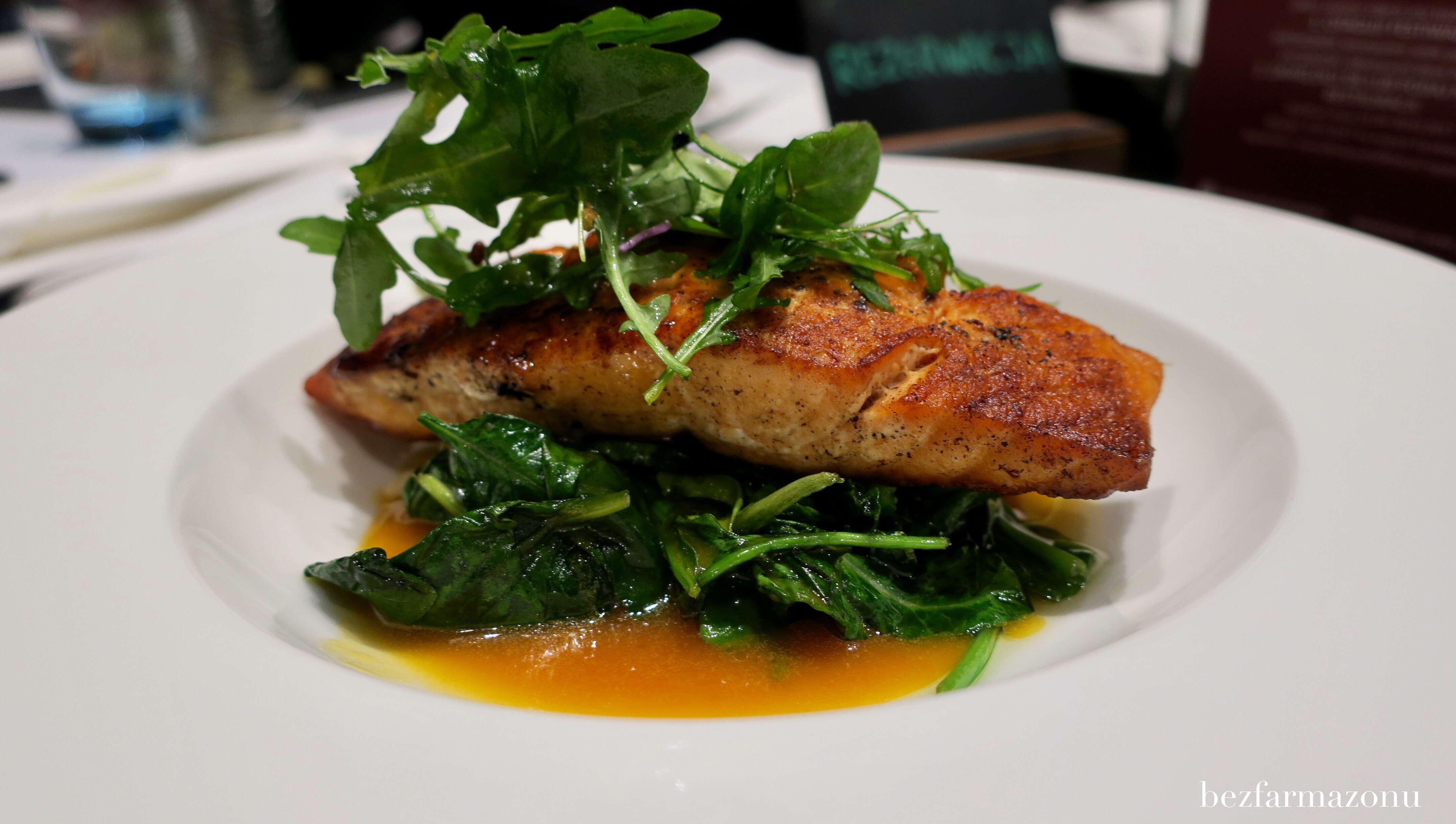 Drugim zestawem była przypieczona na zewnątrz i miękka w środku troć. Ryba smakowała identycznie jak dobry łosoś – w sumie niczym się od niego nie różniła, nawet konsystencja i kolor były takie same. Ale nie ryba była mistrzem tego zestawu lecz to na czym spoczywała – szpinak z sosem pomarańczowym. Prostota szacunek budzi i tutaj się to sprawdziło w 100%. Pyszne danie i do tego jakże fit.