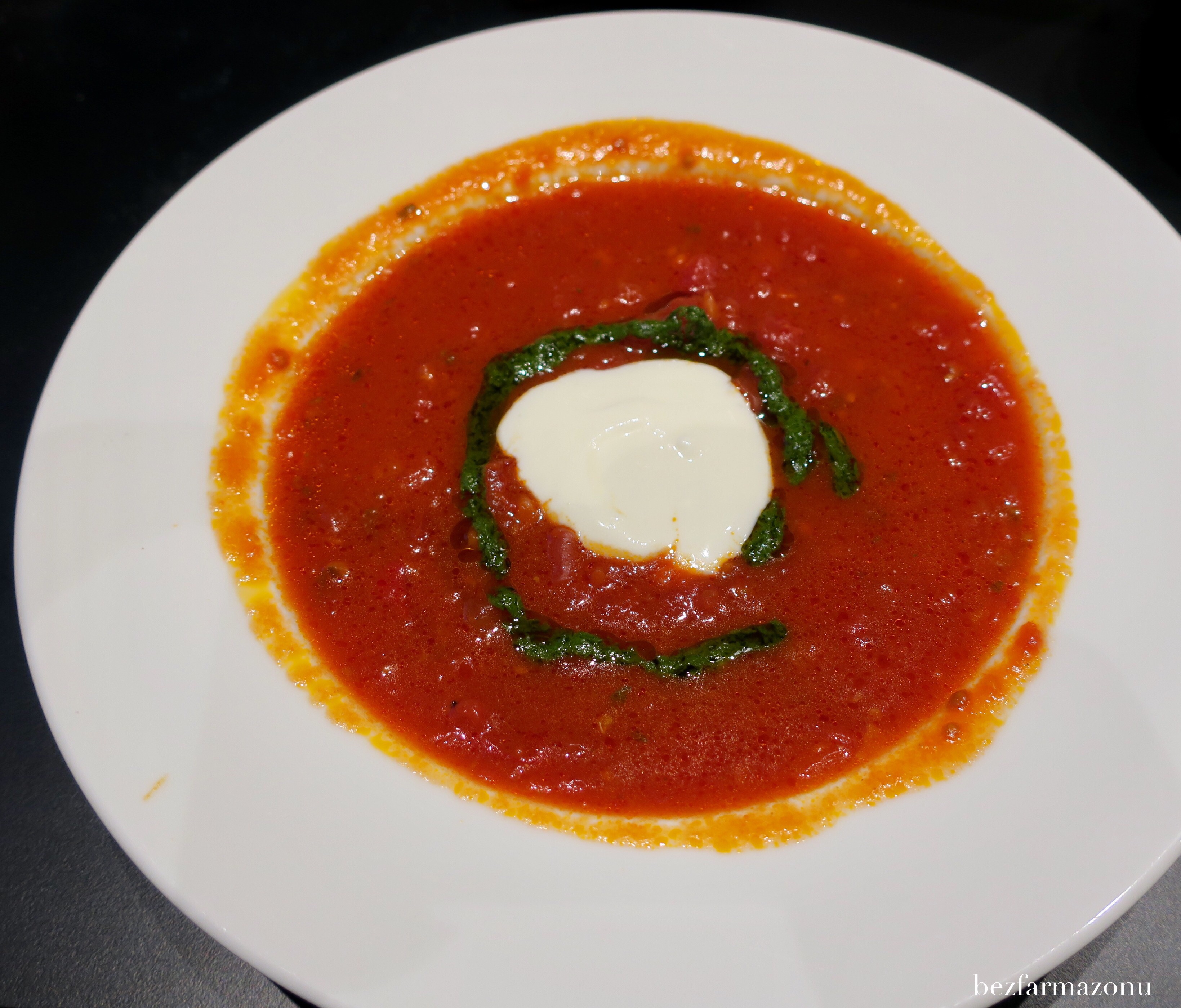 Krem z pomidorów był ciepły, gęsty, normalny bez zaskoczeń i udziwnień. Śmietana i pesto podkręcały smak i sprawiły, że zupa była milsza dla oka.