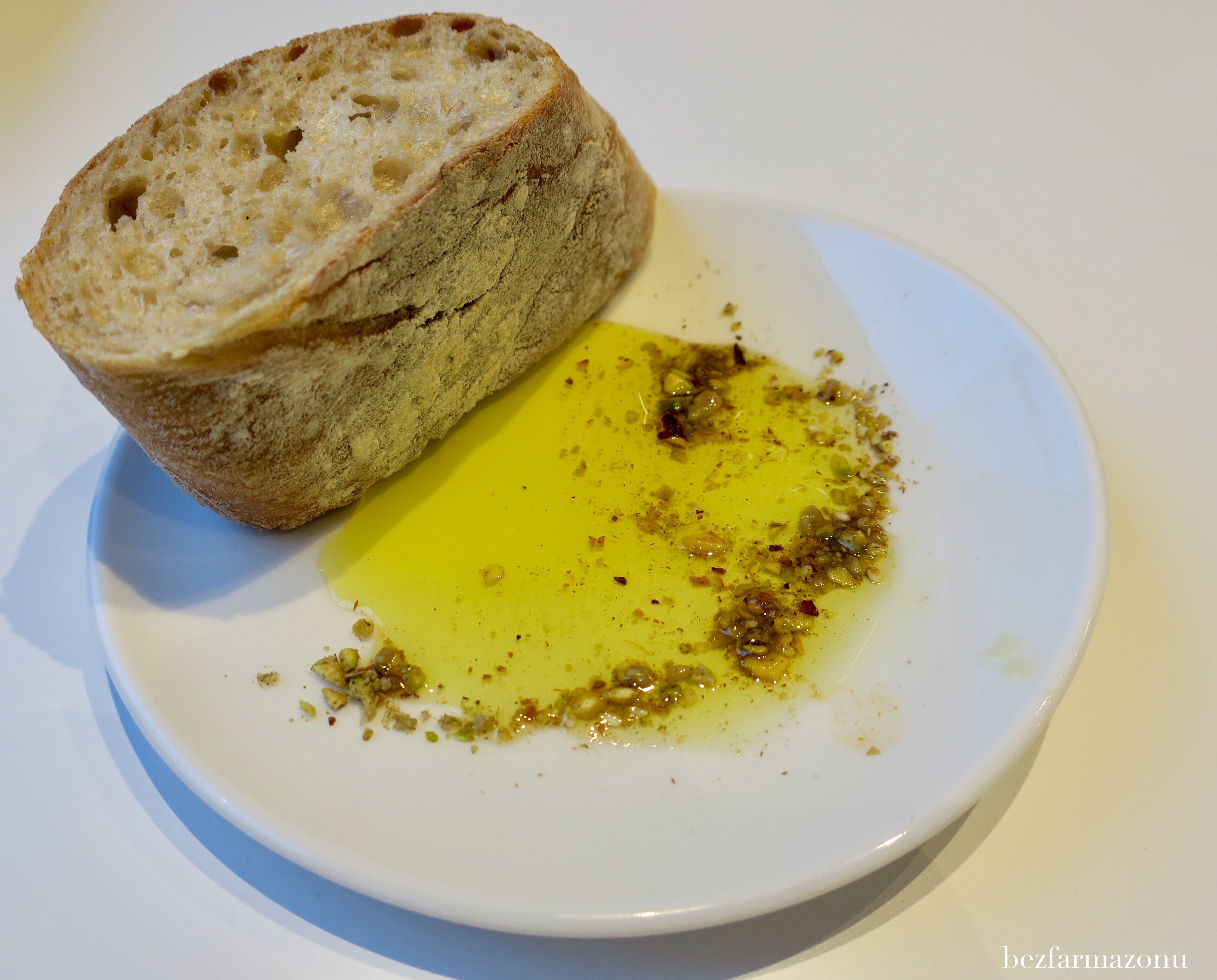 Czekaliśmy i czekaliśmy, a po 15 minutach dostaliśmy gratisowe czekadełko. Koszyczek z bardzo świeżymi, chrupiącymi na brzegach i mięciutkimi w środku bagietkami. Dodatkowo na małych talerzykach posypanych mieszanką przypraw i orzechów Pani polała nam troszkę bardzo dobrej jakości oliwy i butelkę zabrała. Nie wiem może z obawy, że ją wypijemy?