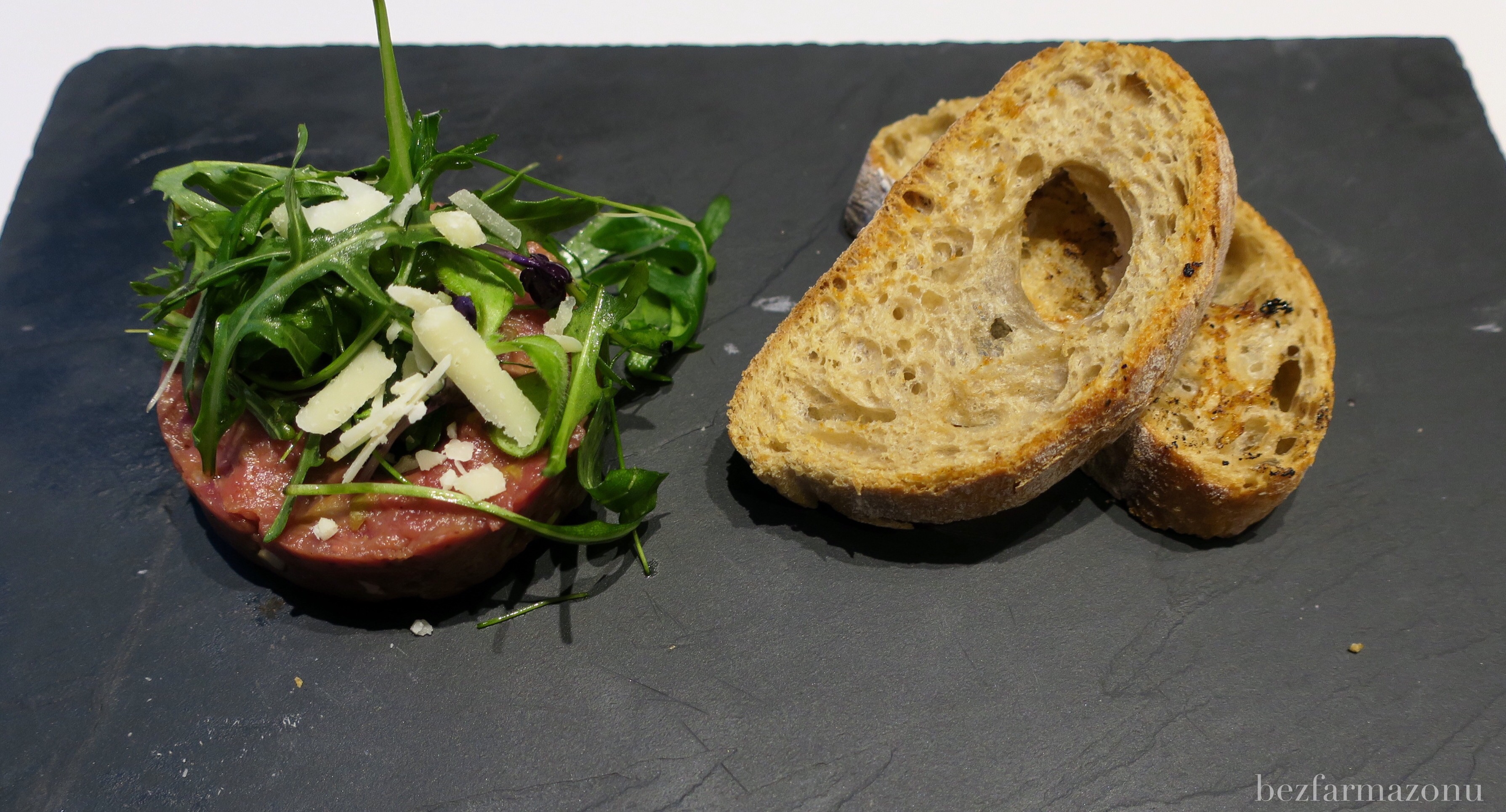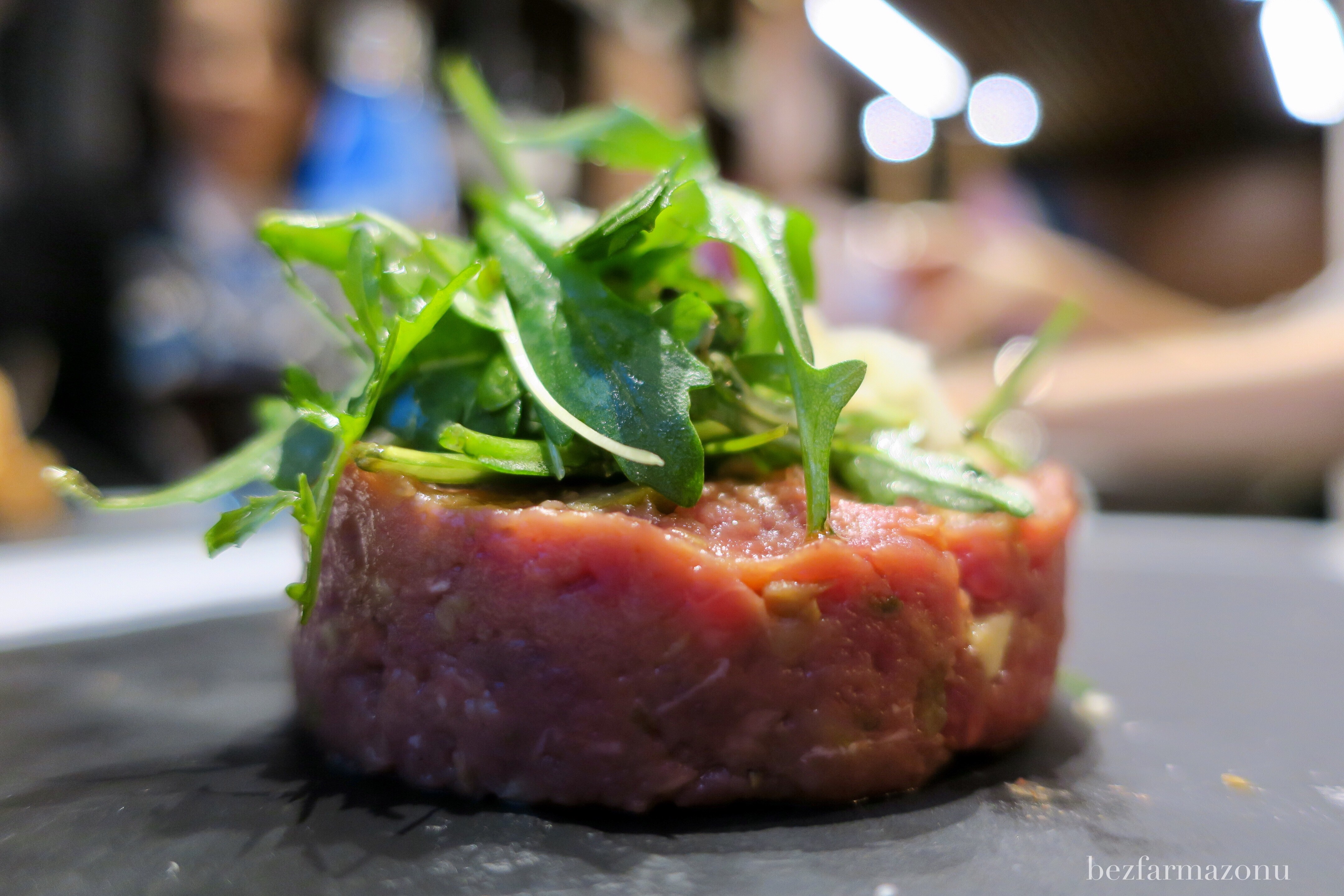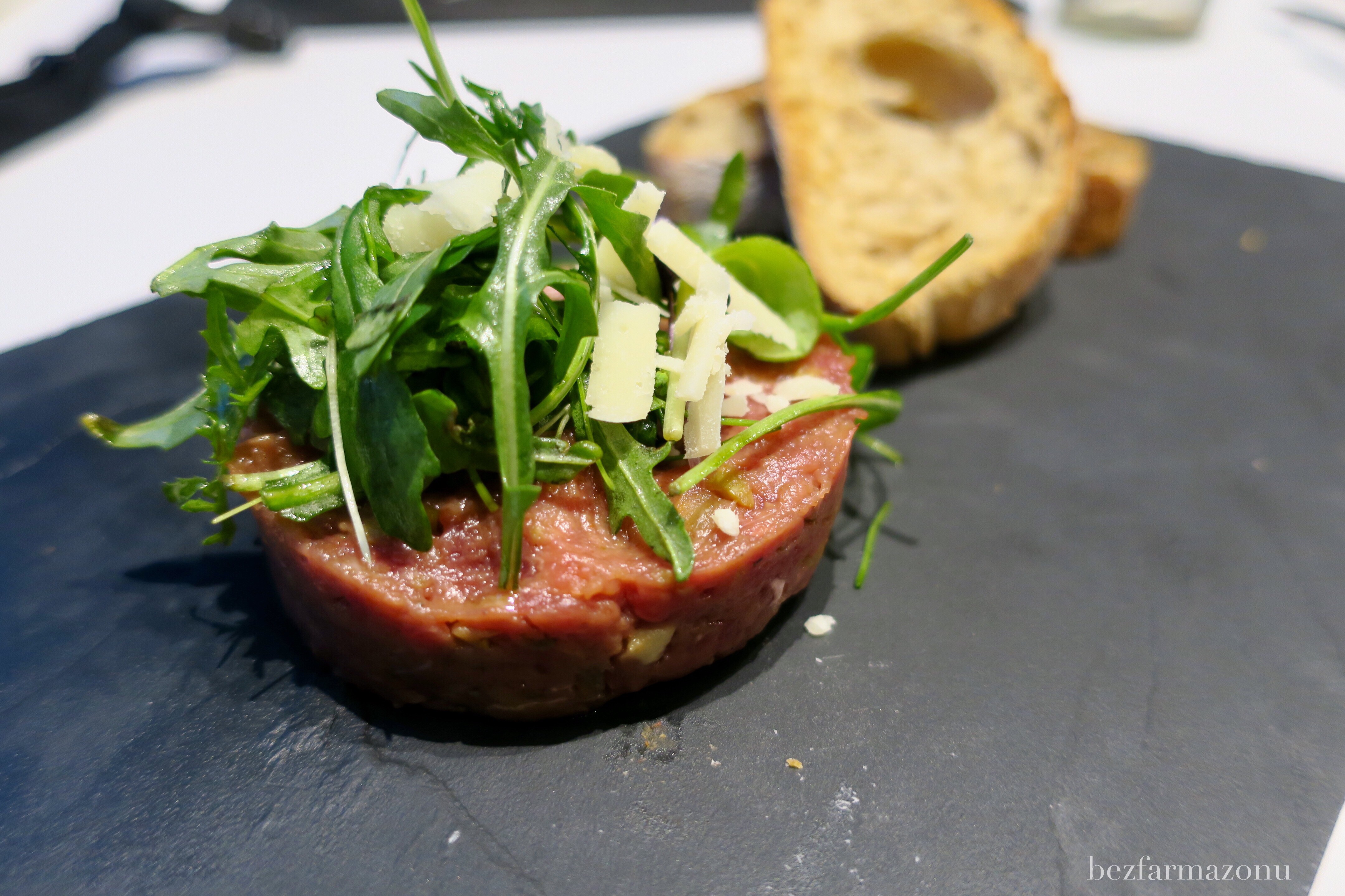 Tatar miał bardzo gładkie i delikatne mięso, był już wymieszany z ogórkami i prawdopodobnie marynowanymi pieczarkami. Zrobiony jakby we włoskim klimacie gdyż posypano go rukolą i płatkami parmezanu (nazwano to mini sałatką). Niestety brakowało mu mocy, werwy, siły. Był lekki i płaski, a na stole nie znaleźliśmy pieprzu i soli, więc o tuningu nie mogło być mowy. Wraz z W. lubimy konkretne i mocne smaki surowego mięsa, opcja powyższa była tego przeciwieństwem. Tatar nie był zły, niektórym może smakować, ale mojego żołądka nie skradł.