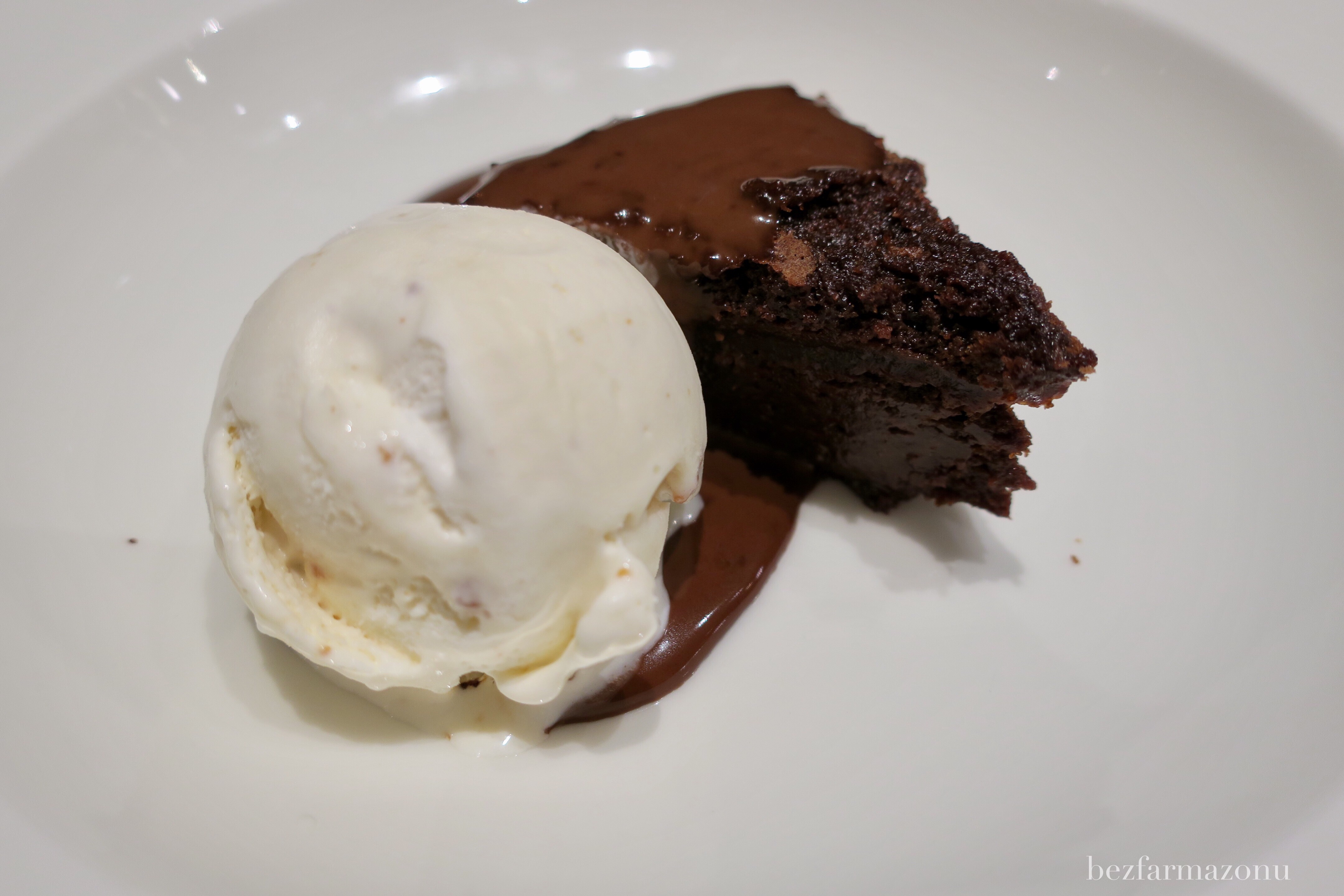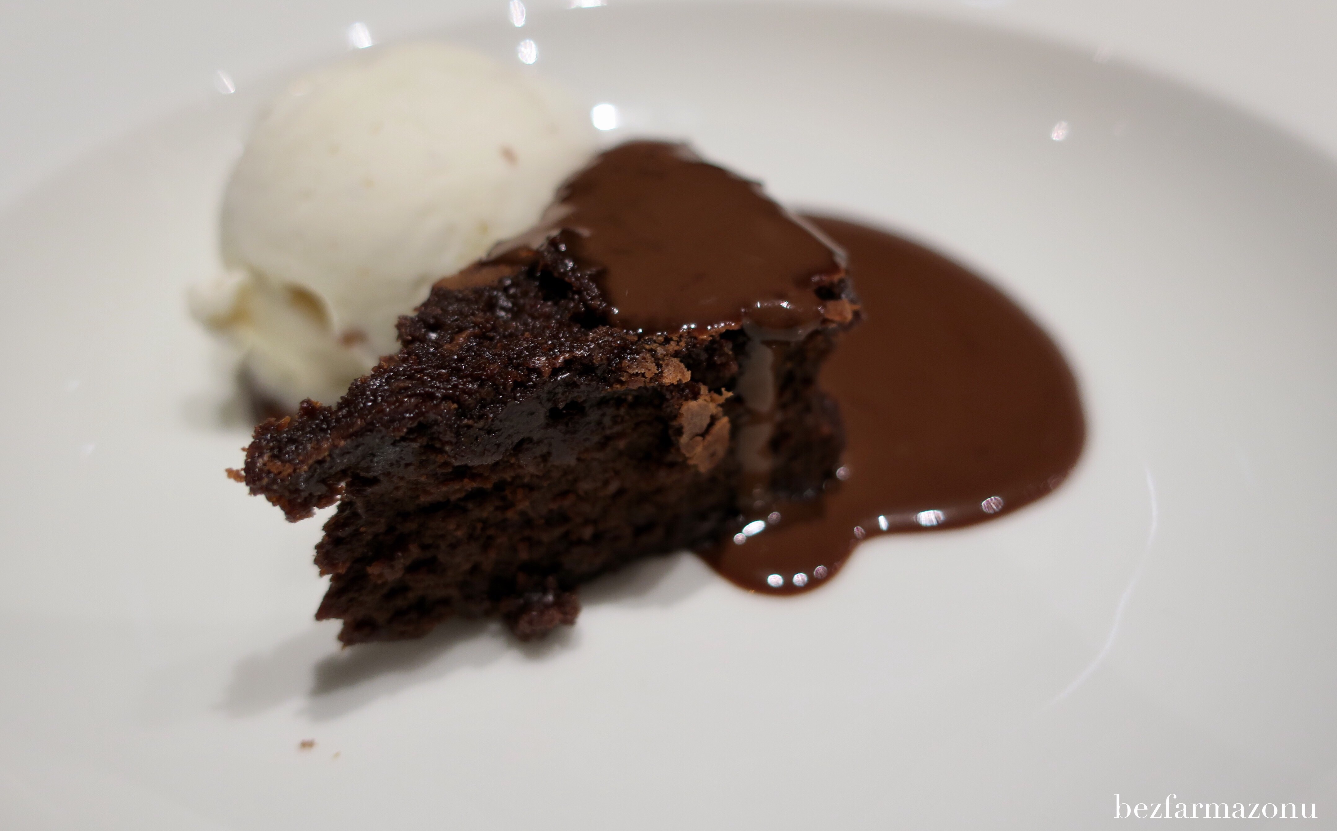 Dobiliśmy do półtorej godziny (15 minut po skończeniu dań głównych), a deserów ani widu ani słychu. Miękkie, mokre, słodkie i sycące czekoladowe brownie w towarzystwie lodów i polewy również czekoladowej w końcu znalazły się na stole. Kawałki orzechów w lodach sprawiły, że nie były to zwykłe, nudne zmarzliny. Cóż tu dużo pisać – deser był wporzo.