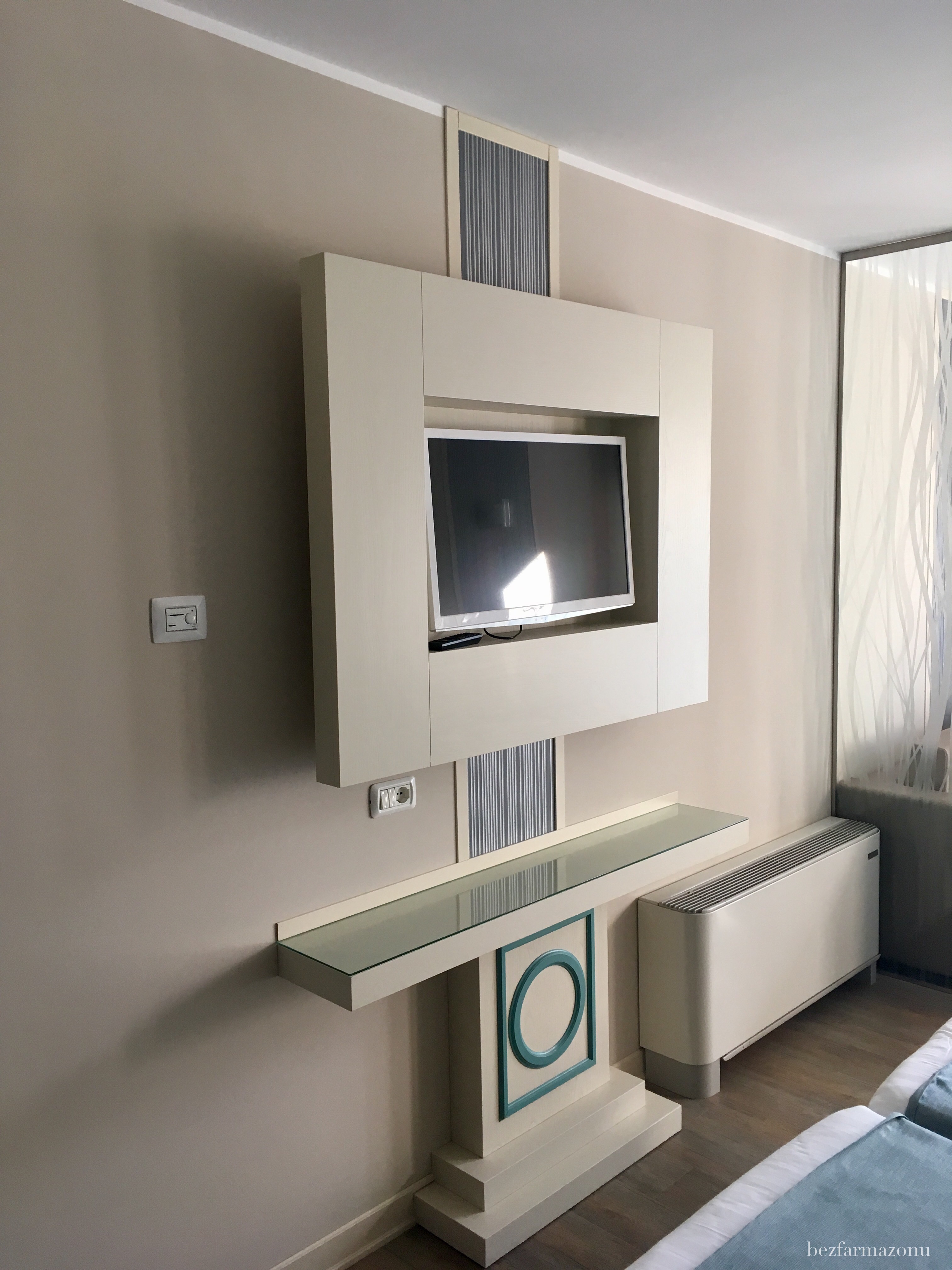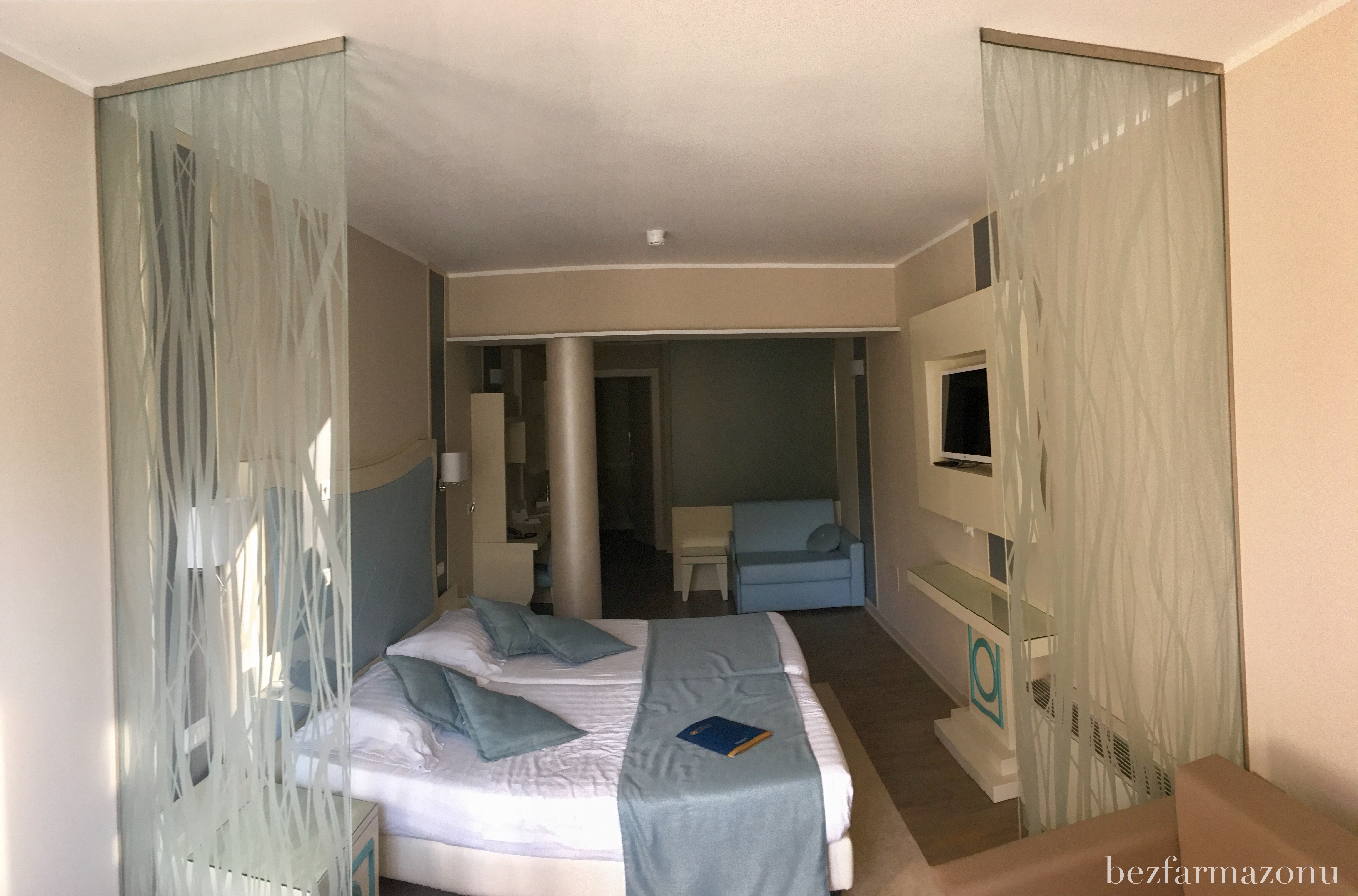 Jest to sporych rozmiarów pomieszczenie z wydzielonymi częściami: przedsionkiem, sypialnią, toaletą, łazienką oraz holem z szafą. Na wyposażeniu jest: telewizor ze sporą ilością kanałów (głównie włoskie i niemieckie), mini lodówka, minimalnej wielkości sejf (zmieści się portfel i tablet o przekątnej maks 7 cali, laptop nie ma szans, cena za kluczyk 1 euro / dzień). Grube zasłony dobrze zatrzymywały światło dzienne, klima / ogrzewanie ciche i wydajne, ustawiane wg własnych upodobań pokrętłem na ścianie.