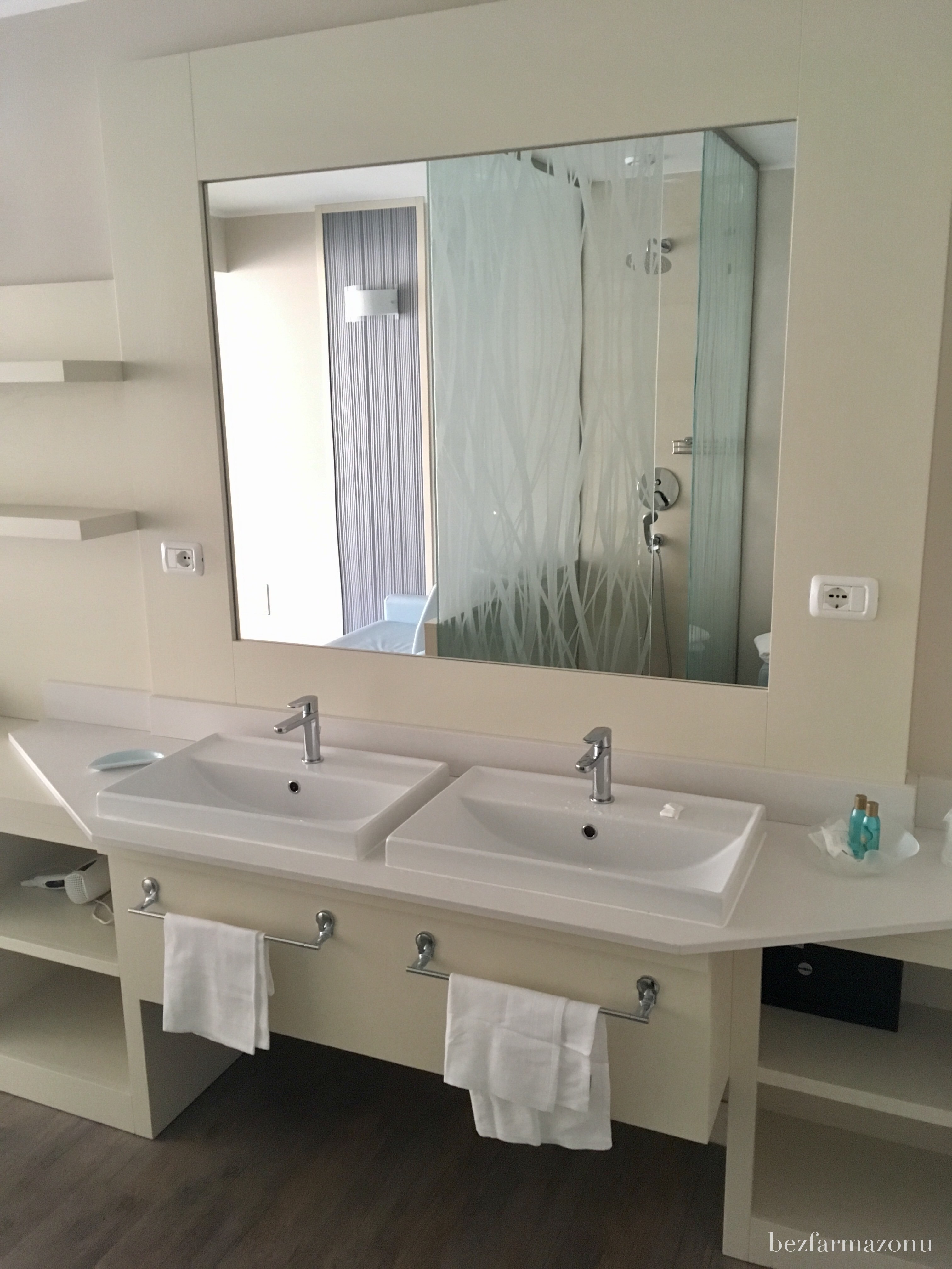 W ŁAZIENCE jest zwykły prysznic i deszczówka, dodatkowo dwa zlewy i zestaw hotelowych kosmetyków. Od salono-sypialni oddzielona jest tylko mleczną szybą. Z tego też powodu mimo bardzo szerokiego łóżka i dwóch rozkładanych sof nie za bardzo można polecić ten pokój rodzinom ze starszymi dziećmi, albo grupie znajomych. Pobyt mógłby być lekko krępujący (chociaż wiadomo – kto co lubi). Całe szczęście w toalecie można zatrzasnąć za sobą prawdziwe drzwi.