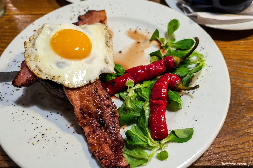 - ja poleciałem na eksperymencie i spróbowałem steka po benedyktyńsku czyli polędwicy wołowej z sadzonym jajem oraz dwoma konkretnymi podłużnymi plastrami boczku (74 PLN). Aby nadać daniu polski charakter poprosiłem o ziemniaczane puree (10 PLN) wraz z kapustą zasmażaną (10 PLN). Mówcie / piszcie co chcecie, ale to była kompozycja trafiona w dziesiątkę! Mięso w punkt na medium, przyprawione pieprzem i solą na tyle, że przypraw nie musiałem dotykać. Plastry boczku wyborne i przyrządzone tak jak lubię – jędrne tuż przed chrupkością. Dodatki w porządku, ale bez efektu wow.
