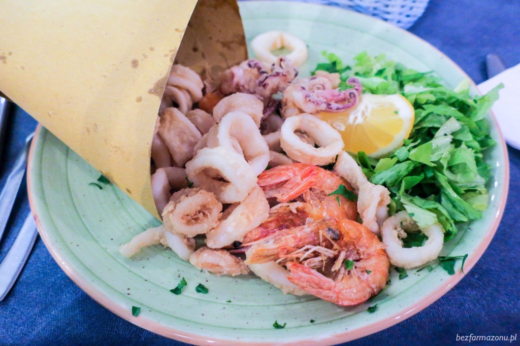 Zamówiliśmy makaron z małżami (13 euro) oraz panierowane owoce morza (chyba 15 euro).