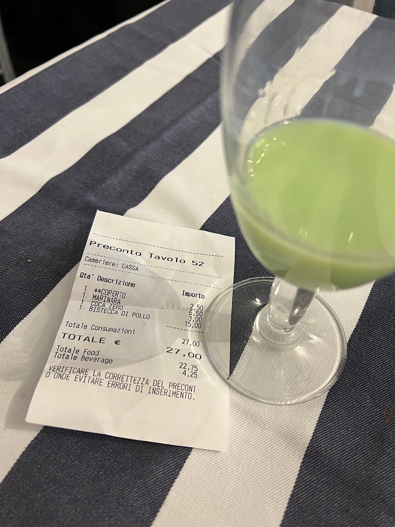 Na koniec kelner przyniósł nam buteleczkę wypełnioną kolorowym, gęstym i słodkim likierem – coś pięknego 🙂 Rachunek wraz z doliczonymi dwoma eurami coperto otrzymaliśmy do stolika i udaliśmy się z nim „do kasy”. W wielu włoskich resto tak to wygląda iż płacimy przy wyjściu – często właścicielowi lokalu.