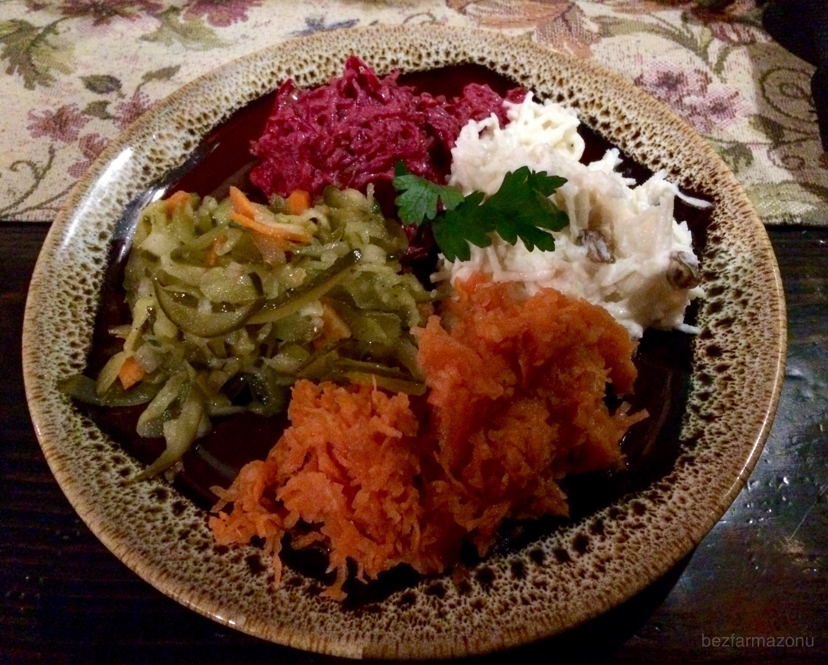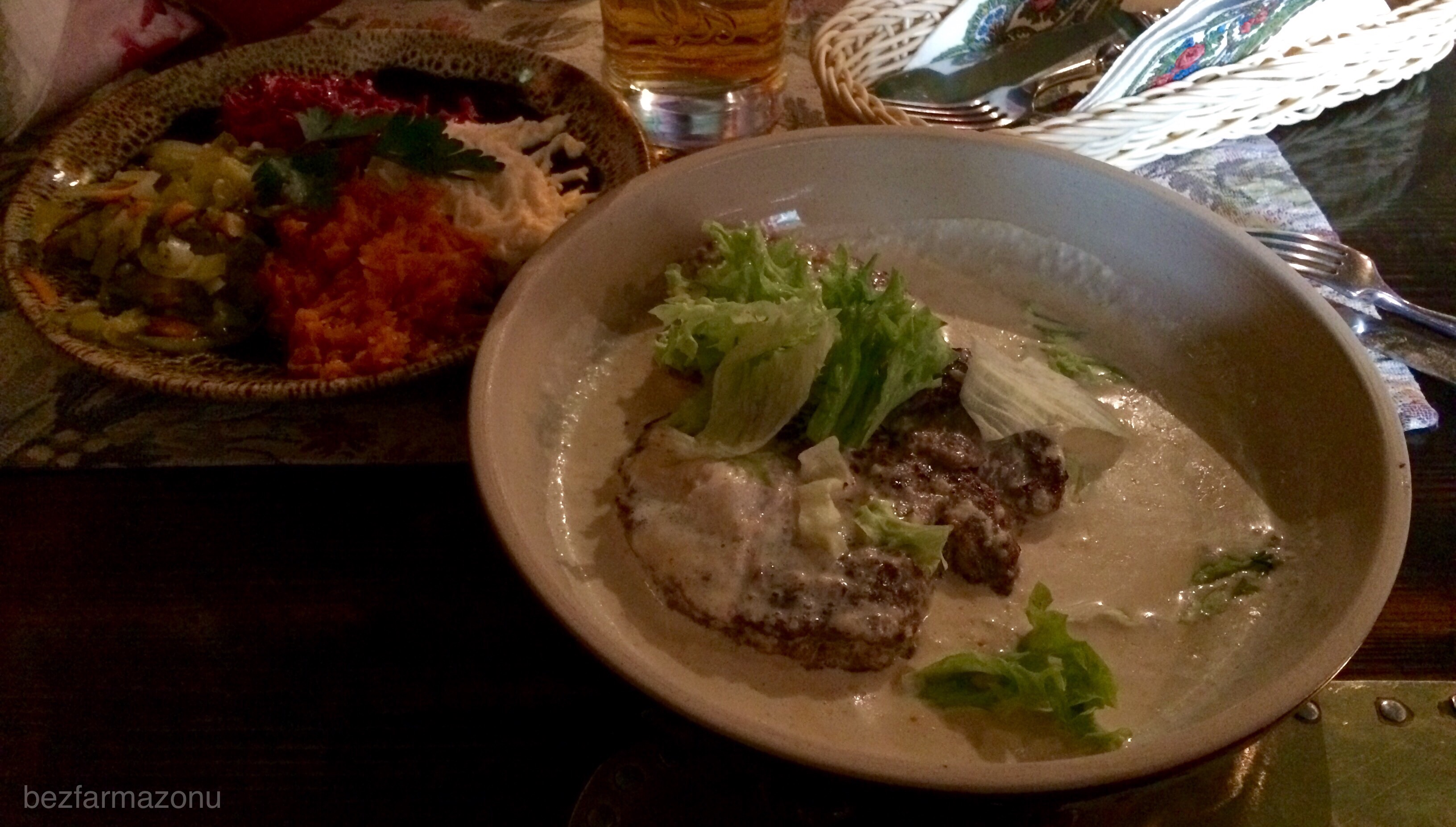 - udziec barani opiekany z masłem czosnkowym w cenie 32 PLN – podany z żurawiną i dodatkowo zamówionym zestawem 4 surówek. Mięso o idealnej, delikatnej konsystencji, które rozpadało się w ustach z bardzo delikatnym nienatarczywym smakiem czosnku. Super.