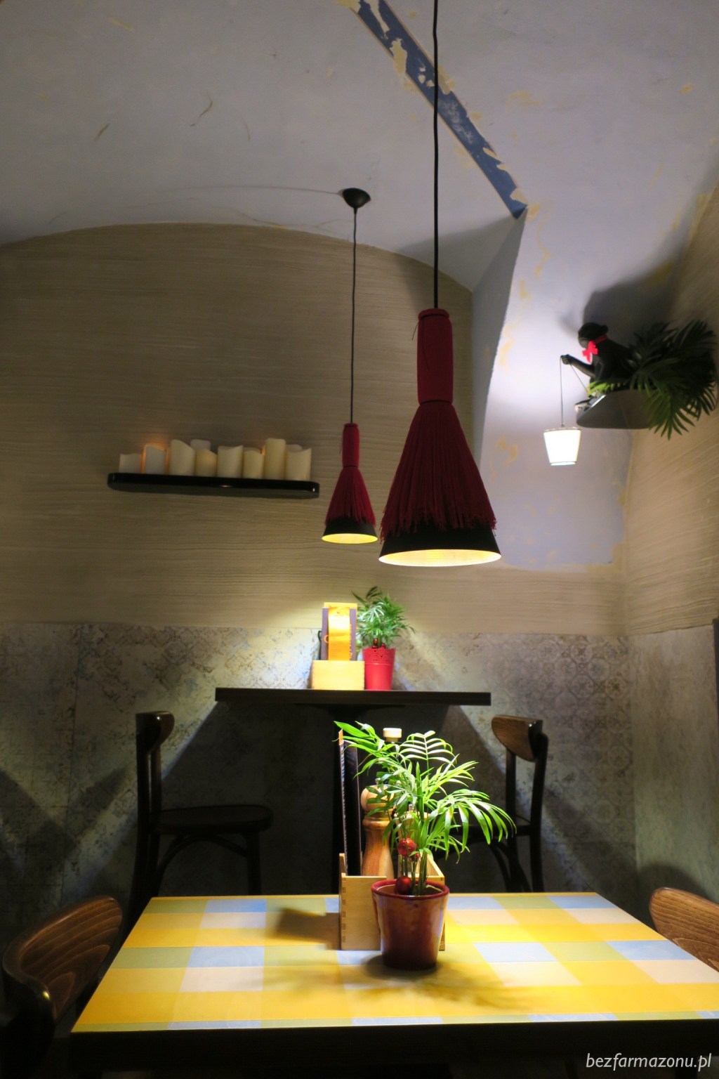Mieliśmy rezerwację, ale o dziwo zbędną, bo w ten mroźny, piątkowy wieczór Monkey Business świecił pustkami. Lokal wydał nam się mało przytulny, a chłód wiejący od okien nie pomagał w zmianie zdania. To co mi się spodobało to punktowe lampy nad każdym z blatów, bo bardzo lubię widzieć co mam na talerzu.