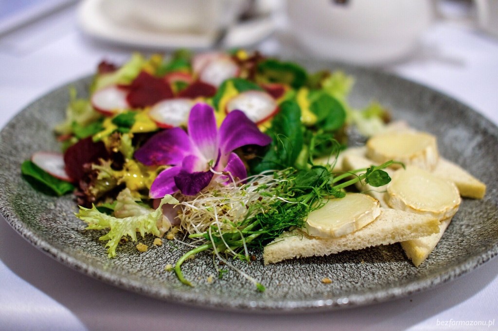 sałata / grzanka z kozim serem / młody szpinak / buraki / orzechowy winegret (28 PLN). Miks sałat i szpinaku, jadalny kwiatek, kilka buraczków i mocny sos – tutaj pozytywnie. Jeśli jednak zerkniecie na zdjęcie poniżej, zobaczycie że sera na tych trzech mini grzaneczkach nie było choćby 50 gram. Nawet jak na kolację to była zdecydowanie za mała porcja.