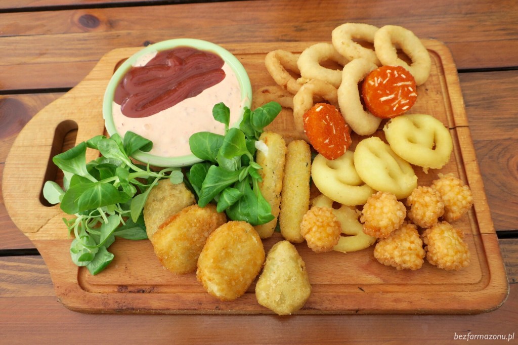 W środku znaleźliśmy krążki cebulowe, kilka różnych serów, ziemniaki i kawałki kurczaka. Wszystko smażone na świeżo, na pewno nie odgrzewane w mikro, ale nie ma co ukrywać to tylko mrożone gotowce (prawdopodobnie te z Farm Frites). Patrząc na tę deskę pod kątem dodatku do piwa nie mieliśmy się do czego przyczepić oprócz tego że kucharz poszedł po najprostszej lini oporu. Było to na tyle dobre na ile może być dobre mrożone jedzenie z torebki wrzucone na gorący olej. Nie powiem, żebyśmy specjalnie się najedli, ale z drugiej strony wcale na to nie liczyliśmy. Nie liczyliśmy także na żadne kulinarne uniesienia – ot chcieliśmy prostej, niezdrowej i tłustej przekąski i taką dostaliśmy. Patrząc pod kątem ilości i jakości ten zestaw powinien kosztować conajmiej dychę mniej.