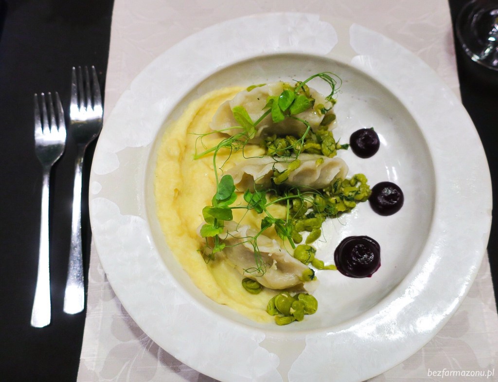 - pierogi z soczewicą i kapustą (28 PLN) podano wraz ze sporą ilością kremu z pasternaku oraz bobu. Za słodki akcent na talerzu odpowiadał mus z buraka. Smakowo super. Ciasto grubsze, ale ciągle miękkie, farsz zdecydowanie wyczuwalny. No i jak na przystawkę, te grubaśne „dumplingsy” okazały się bardzo sycące.