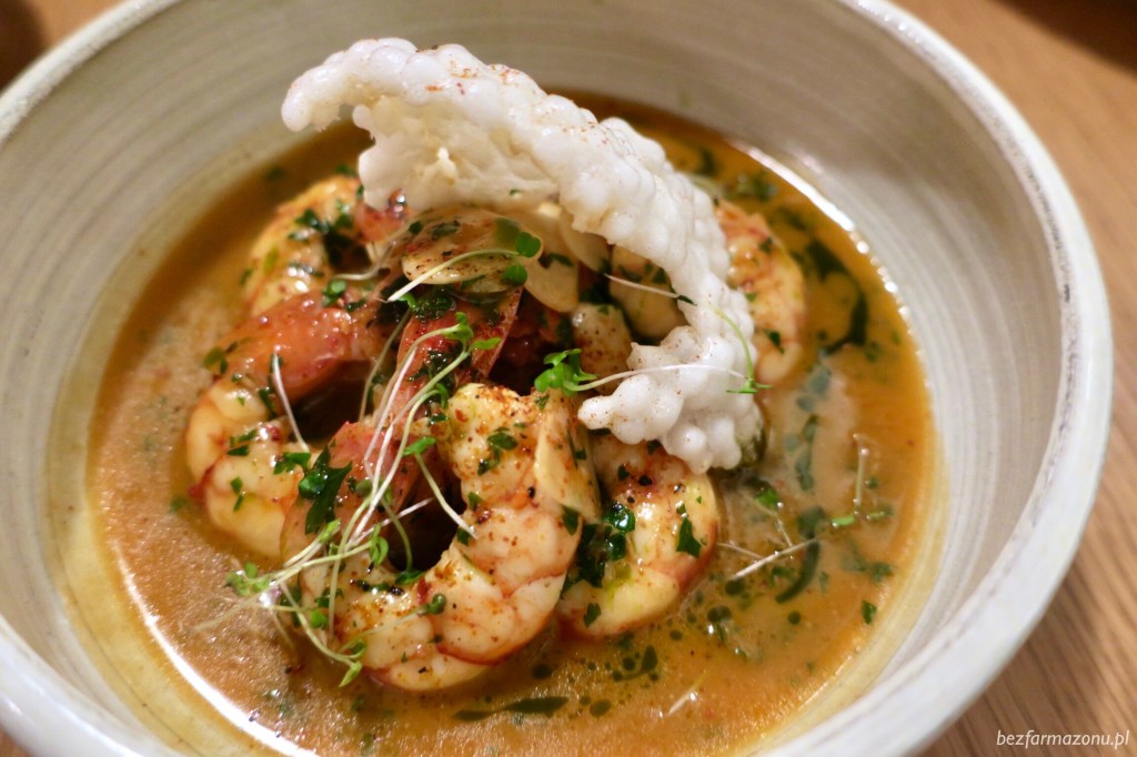 - mięsiste i gibkie smażone krewetki argentyńskie z pokrojonym w paski czosnkiem i pietruszką (42 PLN). Sos z białego wina i masła to taki restauracyjny pewniak, który w tym przypadku dawał mi pełną gastrorozkosz – maczanie chlebka w tej cieczy i jego późniejsza konsumpcja to czysta przyjemność!