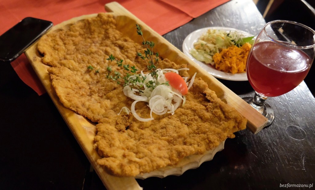 A jak ze smakiem? Panierka owszem chrupała, ale brakowało jej soli – oj jak bardzo brakowało jej soli, a ta jak na złość nie znajdowała się na stole. Do cienko rozbitego i gładkiego mięsa oraz surówek nie mam zarzutów. Tak szczerze to oprócz wielkości nie zrobił na nas specjalnego wrażenia.