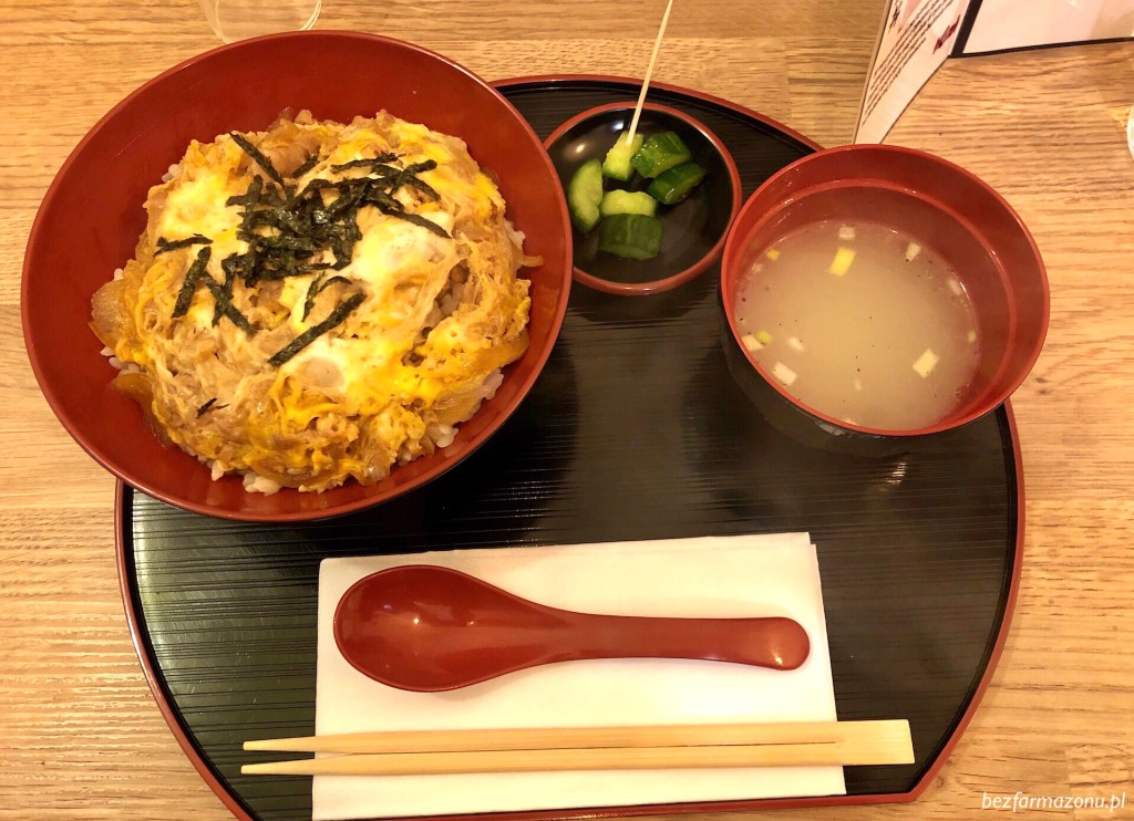 - Katsudon (16 PLN) to również wieprzowina, ale w formie pociętego w paski kotleta schabowego podanego na ryżu i cebulce.