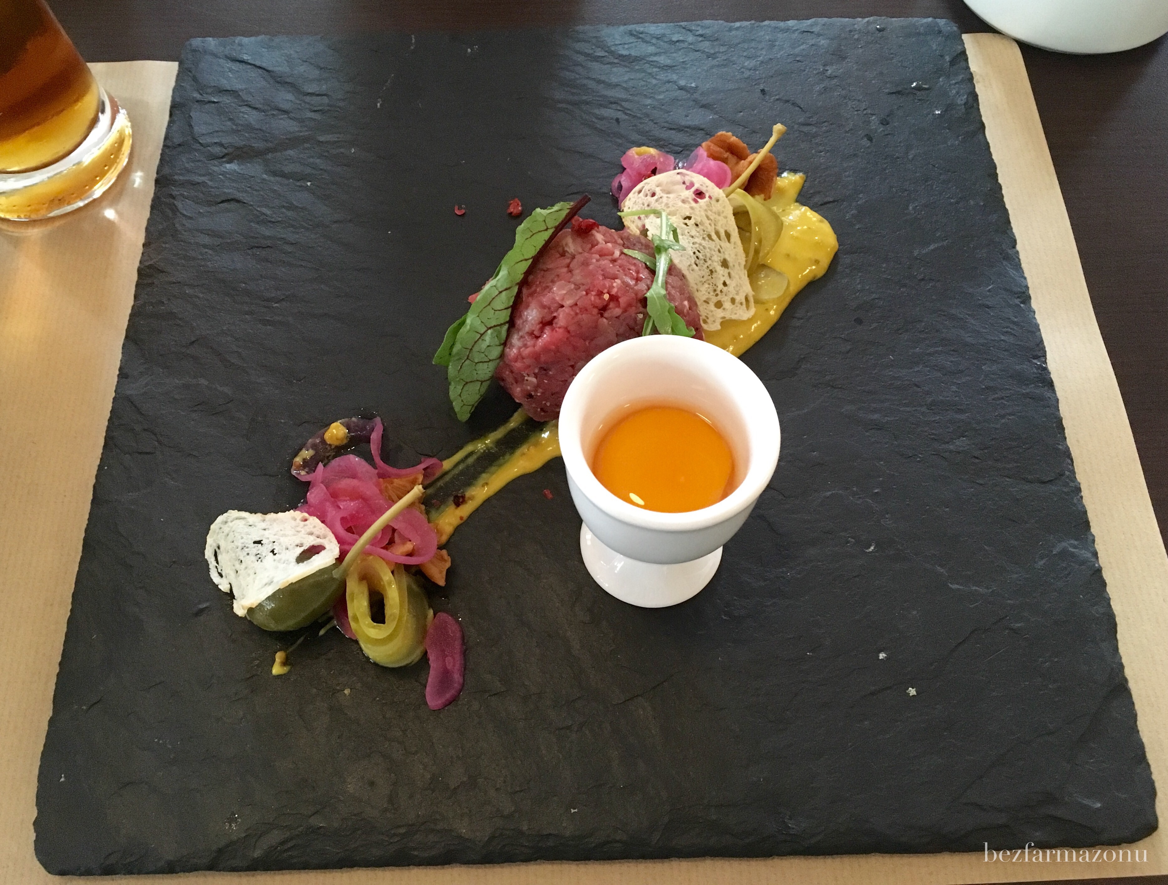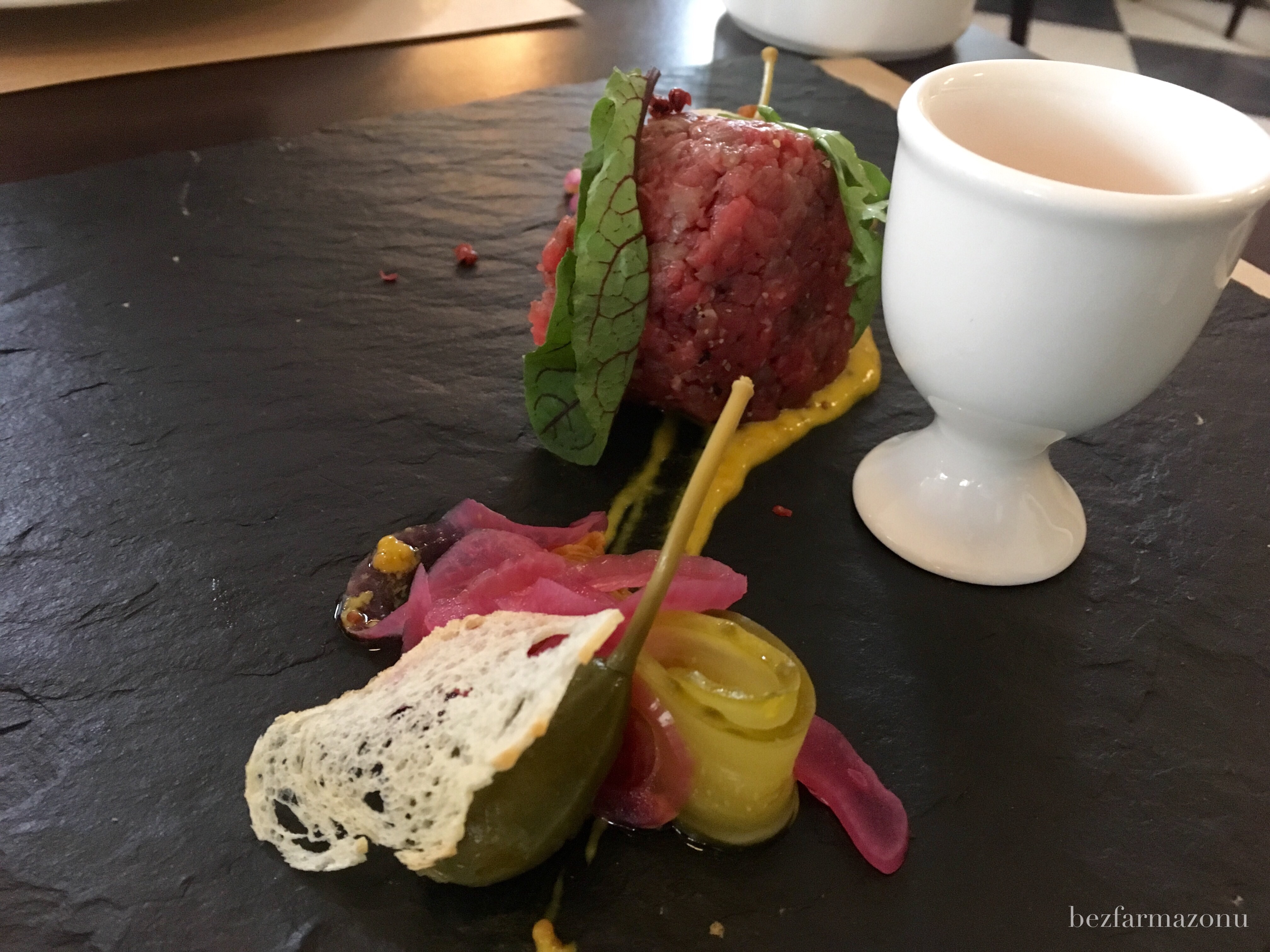 • tatar z polędwicy wołowej z żółtkiem w porcelanowej miseczce  wraz z marynowanym ogórkiem i cebulą , blanszowaną kurką, kaparami oraz sosem musztardowym. Do tego dwa chipsy pieczywa – wszystko podane na kamiennej płycie – 26 PLN. Kompozycja prezentowała się wyśmienicie co można zobaczyć poniżej. Mięso grubo-mielone bez jakichkolwiek twardych części.