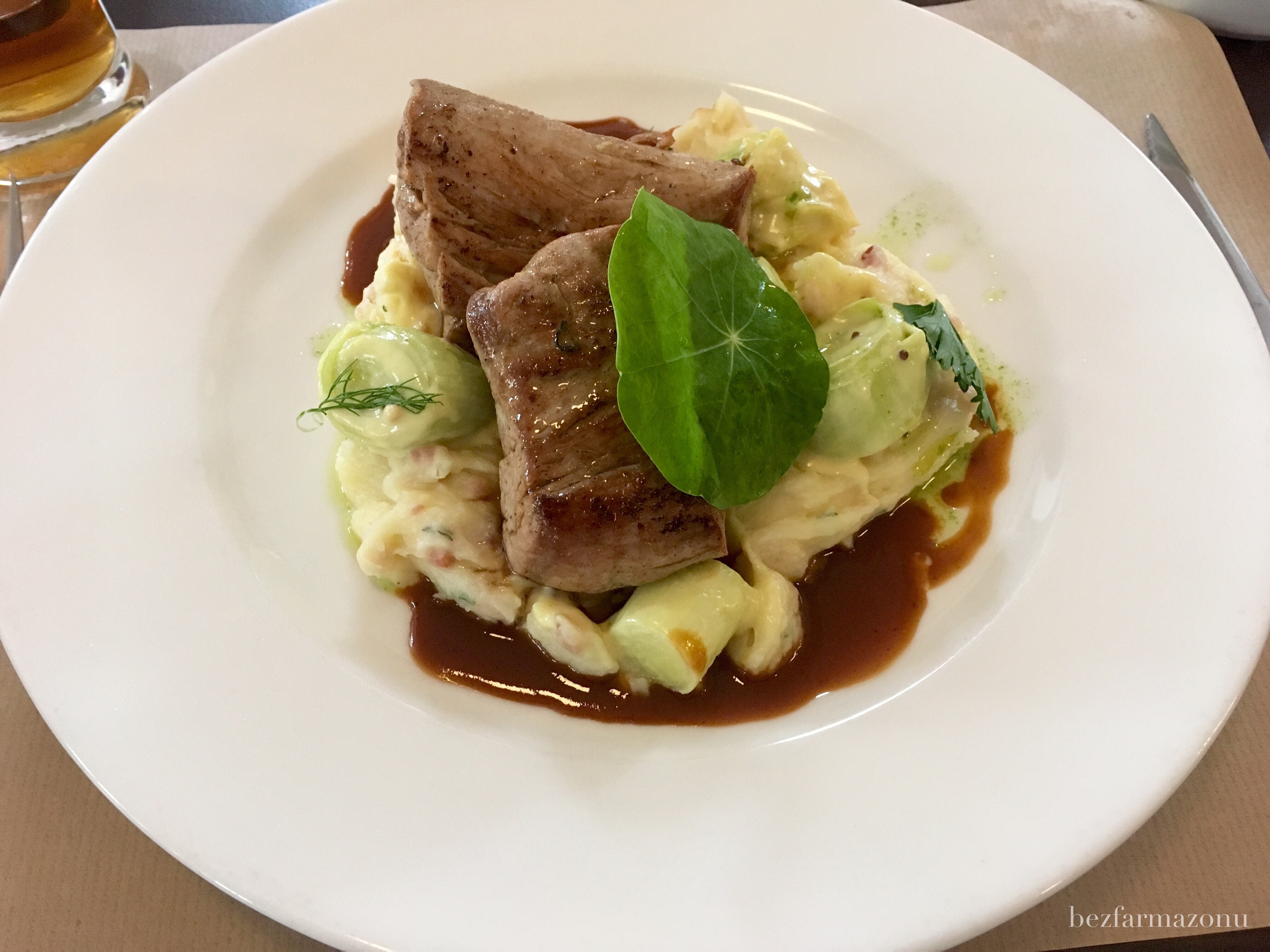 • chwilę zastanawiałem się nad ośmiornicą, ale nie pasowało mi tam opisane jako pikantne ratatouille warzywne z ciecierzycą. Wybrałem więc polędwiczkę wieprzową z pieca wraz z duszonymi w śmietanie z musztardą Dijon porami. Zestaw dopełniało purée z boczkiem i tymiankiem oraz ciemny sos36 PLN. Dwa spore kawałki wieprzowiny idealnie miękkie i upieczone dosłownie tak jak mógłbym sobie tego życzyć – zero tłustych czy niejadalnych części. Jak porów nie lubię, tak te jadłem bez opamiętania i nie mogłem się sam sobie nadziwić jak mi smakują. Puree ziemniaczane było mistrzowskie. W tympoście pisałem, że najlepsze jadłem w Ed Redzie – to już przeszłość – pałeczkę przejmuje od teraz forma „zakładkowa”