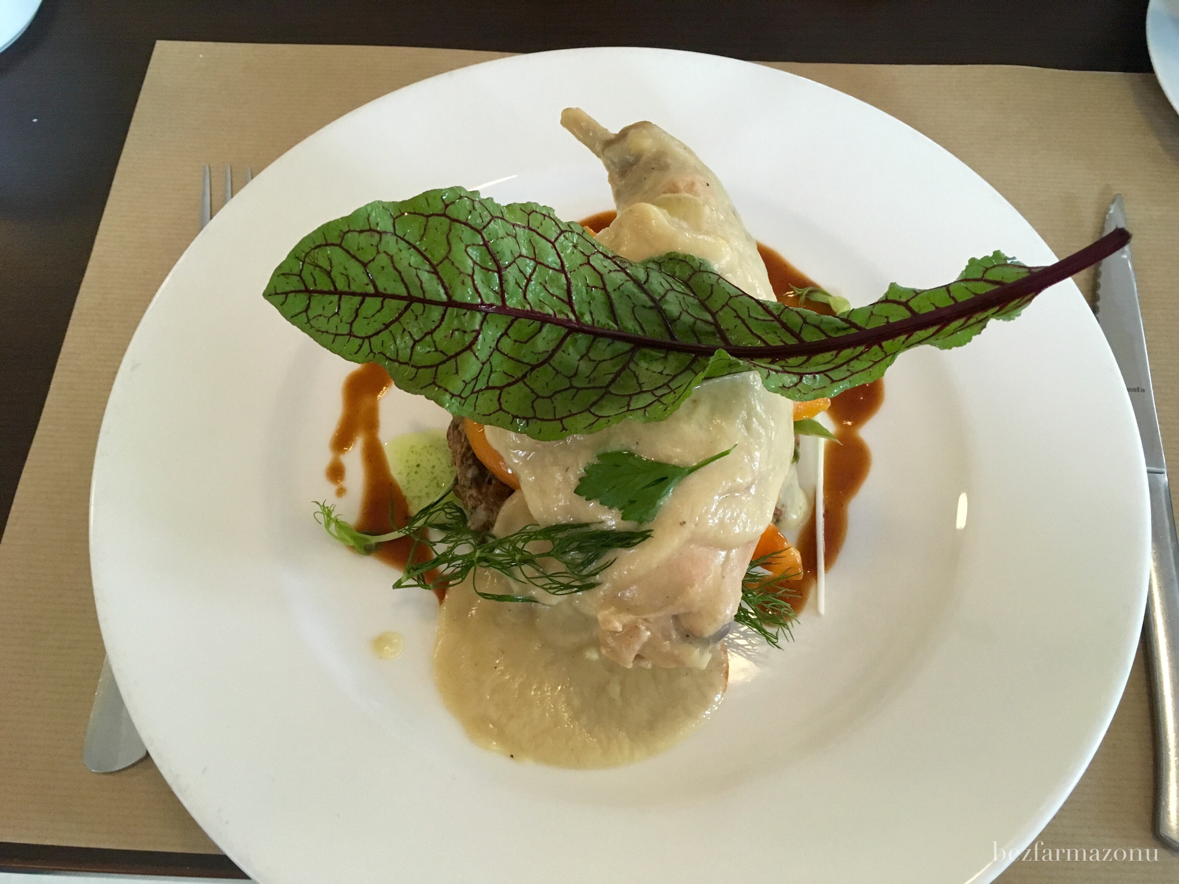 • comberki z królika marynowane w ziołach, krem z gruszki, szparagi, plaster szynki dojrzewającej (26 PLN). Tutaj bardzo pozytywnie zaskoczyło mnie super dyskretne w smaku i kruche mięso. Całość fajnie grała ze słodkim gruszkowym gęstym sosem.