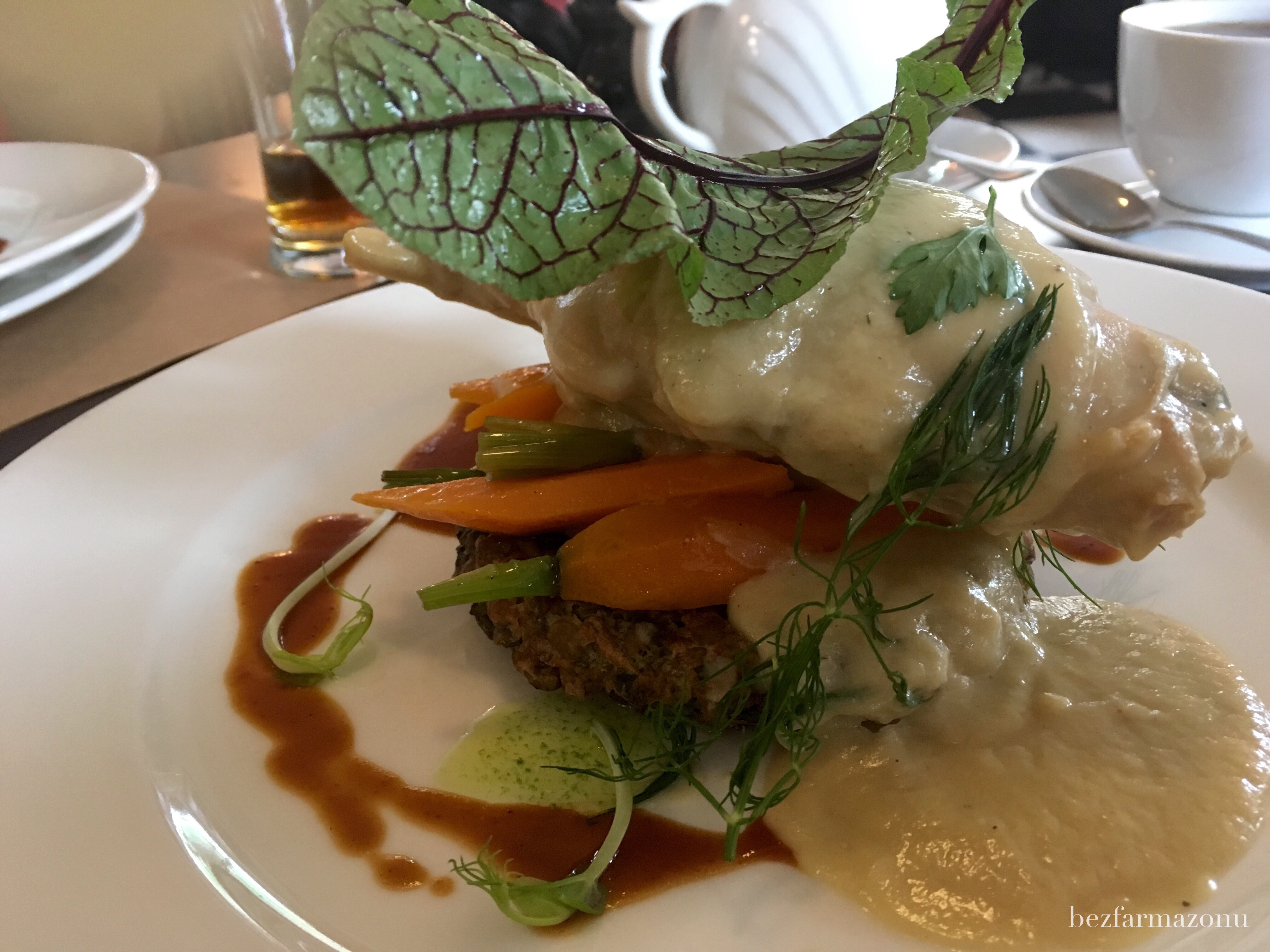 • udko królika podane na racuchu z soczewicy wraz z marchwią z młodym imbirem – wszystko polane sosem z kwaśnej śmietany – 39 PLN. Ja odrzuciłbym to danie od razu ze względu na soczewicę, K. ją lubi więc to był jej wybór. Mięso też miękkie i delikatne jak w śwince opisanej powyżej. Soczewicowy placek mi akurat nie podszedł – był suchy i twardy, ale współtowarzyszka zjadła bez zająknięcia. Super były małe lekko twarde marcheweczki – imbir był rzeczywiście wyczuwalny;