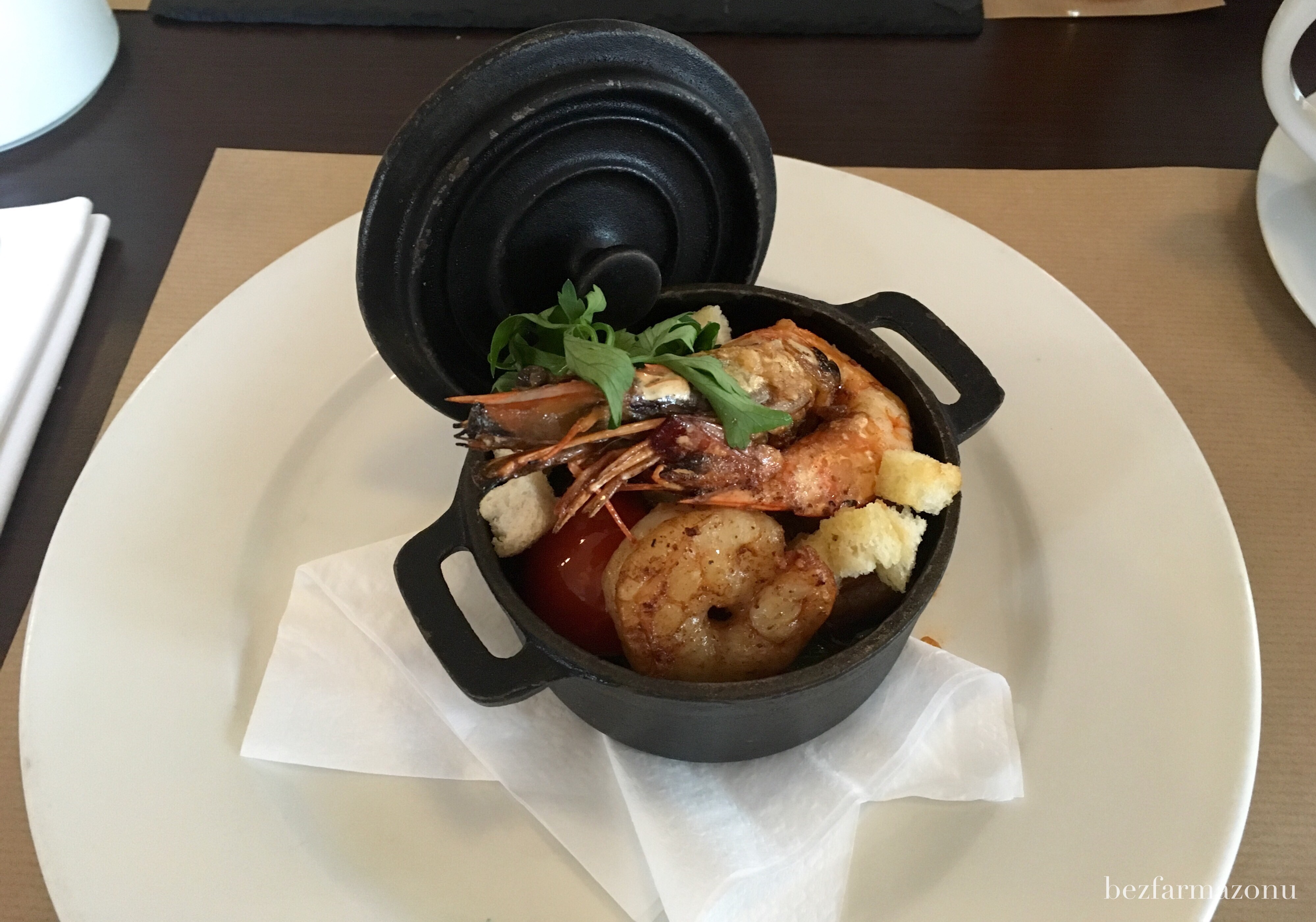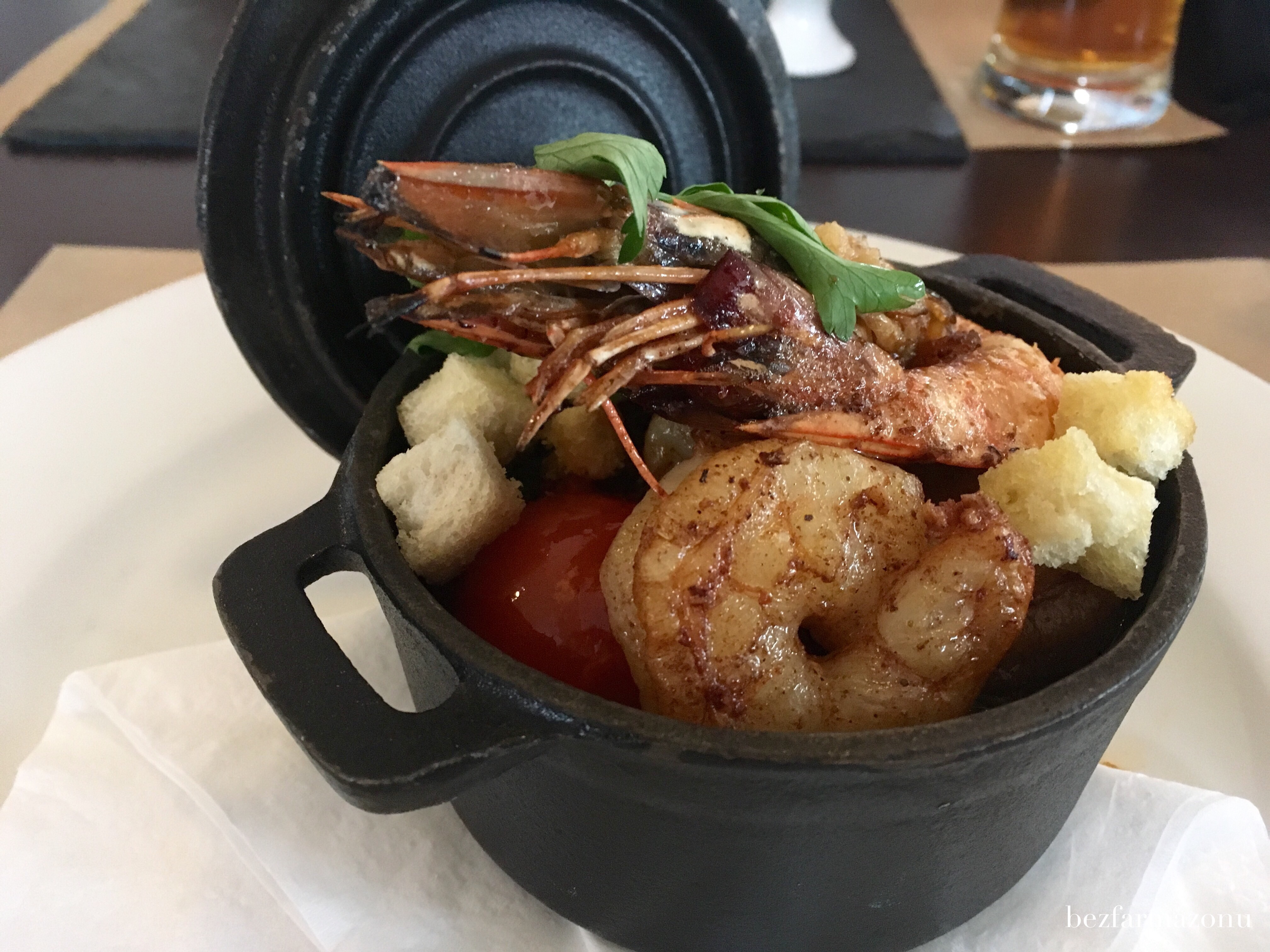 • K upatrzyła sobie garnuszek krewetek na ciepło podanych w żeliwnym rondelku wraz ze szpinakiem, pomidorem oraz grzankami czosnkowymi – 26 PLN. To co w tym zestawie było najważniejsze czyli owoce morza (było ich około 5 sztuk) to idealnie sprężyste krewetki tygrysie. Szpinak i pomidorowa baza rozpływały się w ustach, a sos z nich powstały był bardzo ciepły i aromatyczny. Krewetkę na samej górze przyrządzono tak, iż aby pozbyć się głowy wystarczyło lekko odciąć ją widelcem – bez szamotaniny i dłubania rękami.