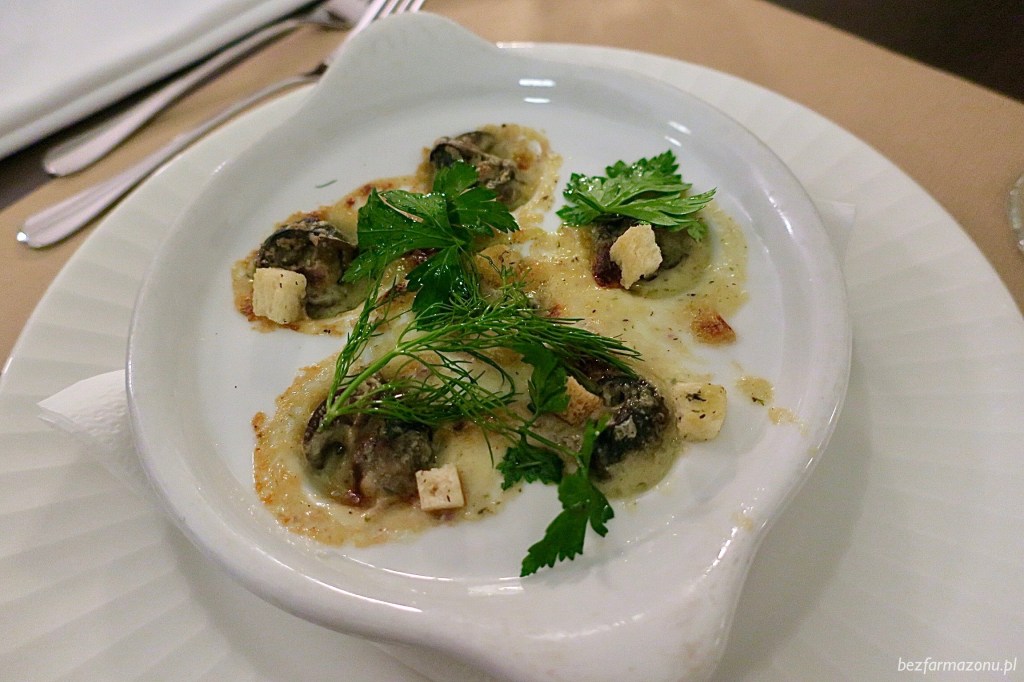 Za koleją przyszły te które wywołały najwięcej komentarzy – ślimaki zapiekane w czosnkowym kremie – mała porcja za 27 złotych. Konsumentka P. nie poradziła sobie z tym testem, jednak chłopaki dookoła pomogli i finalnie tygielek został wyczyszczony do zera. Konsystencja ślimaka jest taka jakiej się spodziewacie – miękka i lekko gąbczasta – same w sobie są neutralne, ich smak determinuje otoczka. W poniższym przykładzie czosnek i pietruszka.