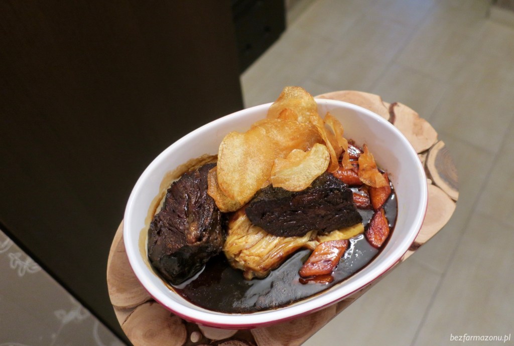 Nie ukrywam, że na zestaw poniżej czekaliśmy najbardziej. Długo gotowany policzek wołowy (45 PLN) wrzuciliśmy na piętnaście minut do podgrzanej do około 70 stopni wody, a później przesmażyliśmy na patelni na mocnym ogniu z każdej strony. W międzyczasie na zapiekankę gratin położyliśmy masło i wstawiliśmy ją w żaroodpornym naczyniu do nagrzanego do 150 stopni piekarnika. W rondelku zagrzaliśmy sos z czerwonego wina, a na patelni obok obsmażyliśmy glazurowaną pieczoną marchew. Po połączeniu składników posypaliśmy wszystko ziemniaczanymi chipsami. Danie wyszło obłędnie dobre – polik idealny, a zapiekanka super miękka. Bierzcie w ciemno.