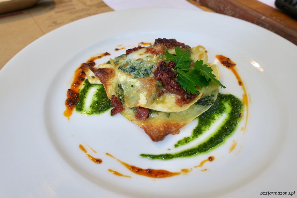 Po swoim daniu z MENU A: lazanietta z mozzarellą di Buffala, pokrzywą i suszonymi pomidorami, nie wiedziałem czego się spodziewać… Bo czymże jest ta lazanietta? Małą lasagną? No tak ! Raz, że mniejsza, a dwa, że nie taka zwarta i równa, lecz bardziej rozproszona. Miejscowo mocniej przypieczone części smakowały fenomenalnie. Płaty makaronu i treść pomiędzy nimi również perfekt. Pyszności.