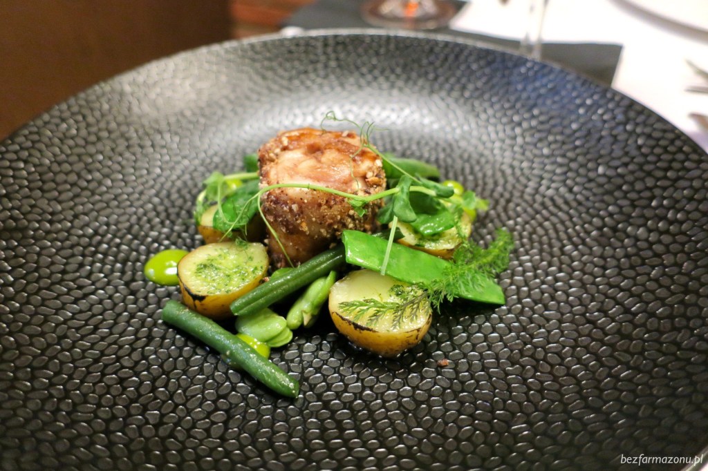 - Danie główne MENU A: confitowane udko z kurczaka w demi glace z crunchem z orzechów, pieczone ziemniaki w stylu krakowskiego kumpiru z masłem ziołowym, majonez z krwawnika, groszek cukrowy, bób, fasolka szparagowa.