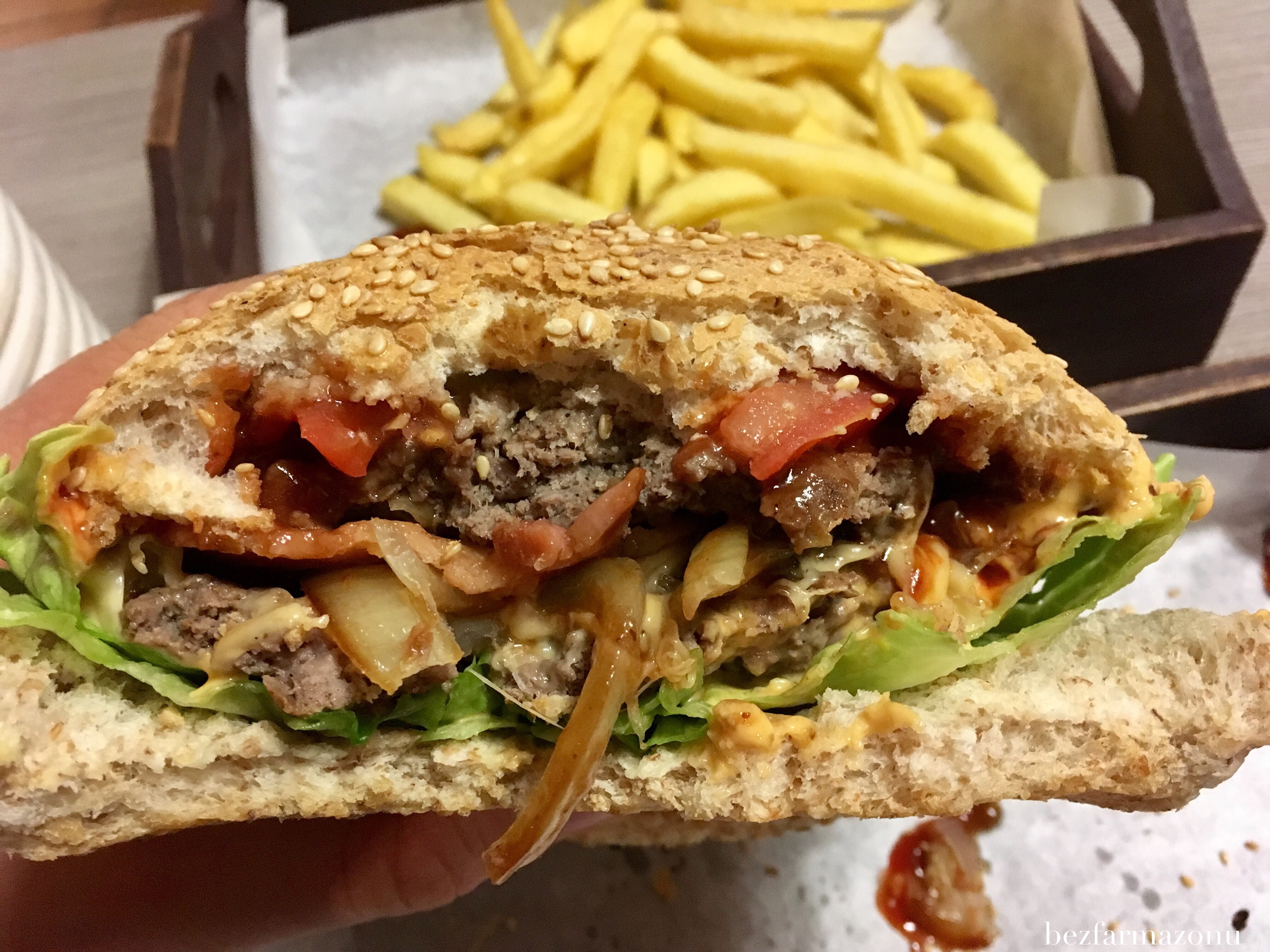 Chrupiąca i bardzo sezamowa bułka zmieściła dwa kotlety, warzywa, smażoną cebulkę, żółty ser, bekon i sporo sosu. Świeże frytki chrupały aż miło 🙂 Mięso takie sobie, ale reszta super.