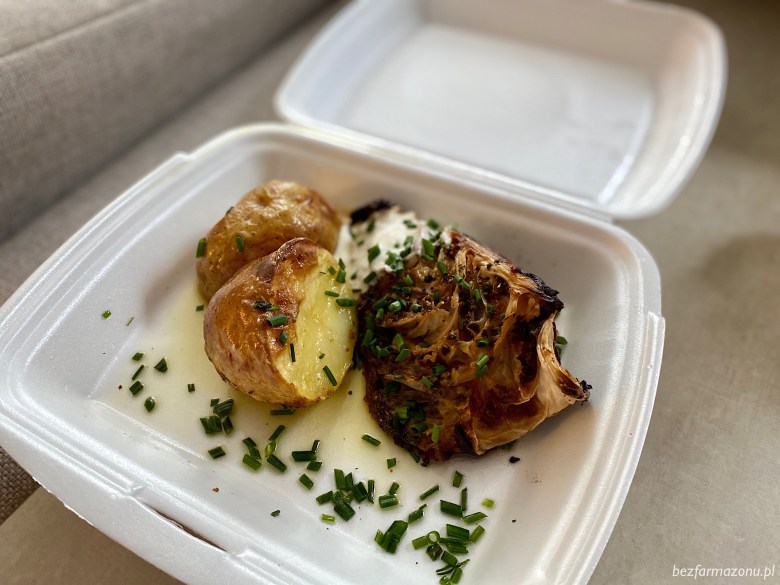 - pieczony stek z włoskiej kapusty z kwaśną śmietaną ze szczypiorkiem i mundurkowym ziemniakiem z masłem (18 PLN). Powiedzcie sami – czy to jest standardowa VEGE oferta osiedlowych barów? No jasne, że nie! Świetny pomysł, dobre wykonanie, polecamy.