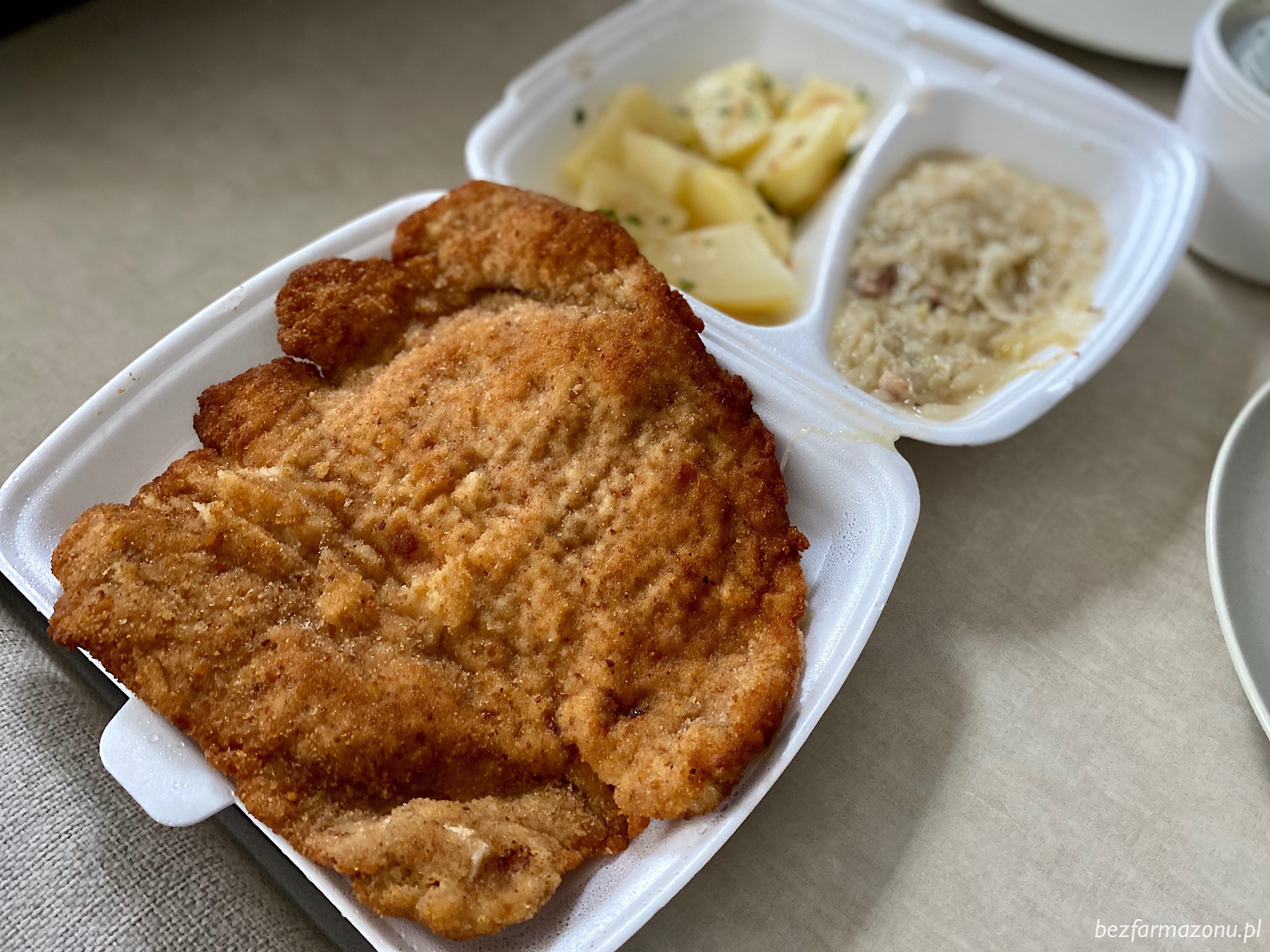 - przeogromny, chrupiący i świeżusi schabowy z gotowanymi ziemniakami i zasmażaną kapustą (28 PLN)
