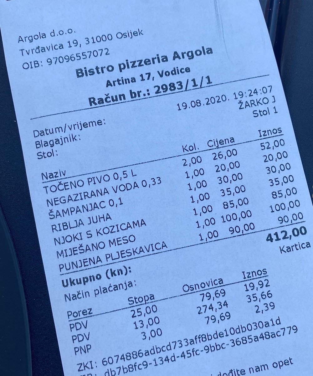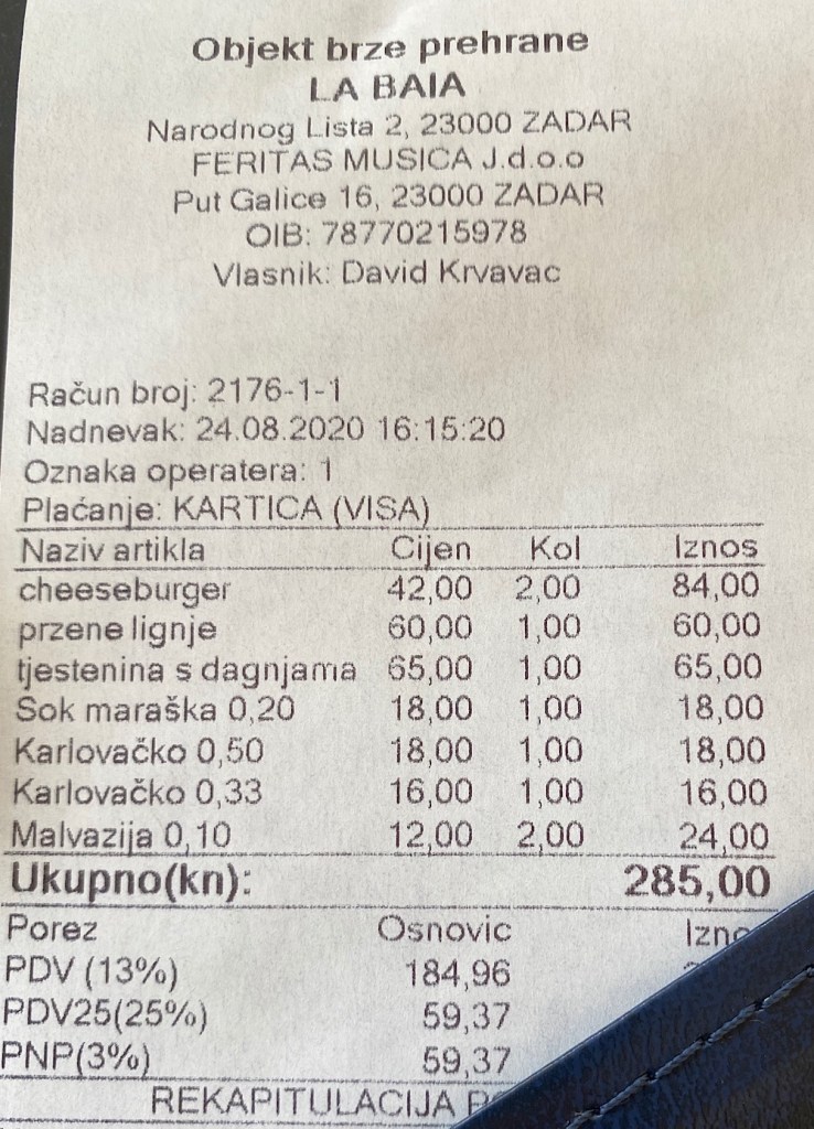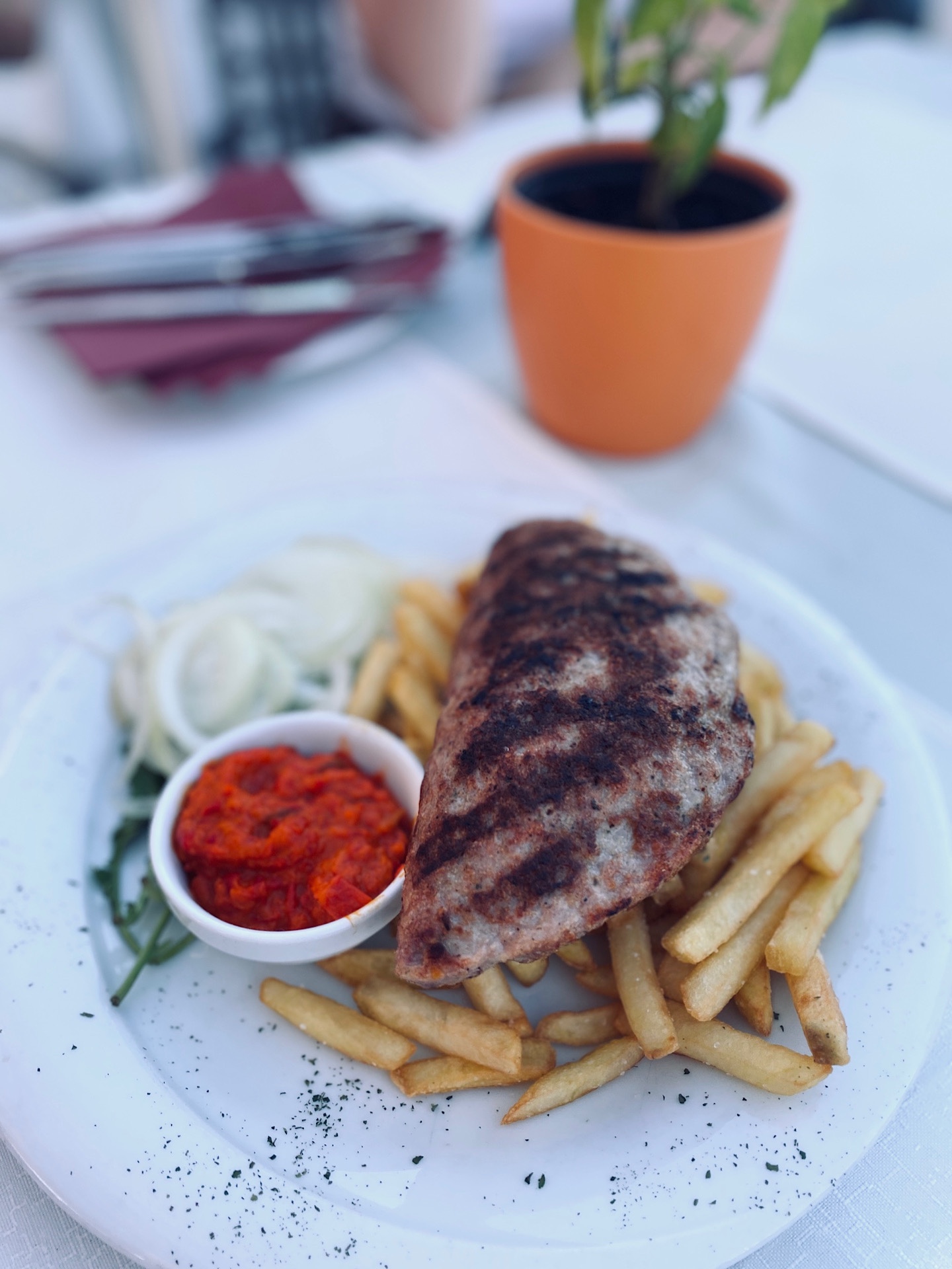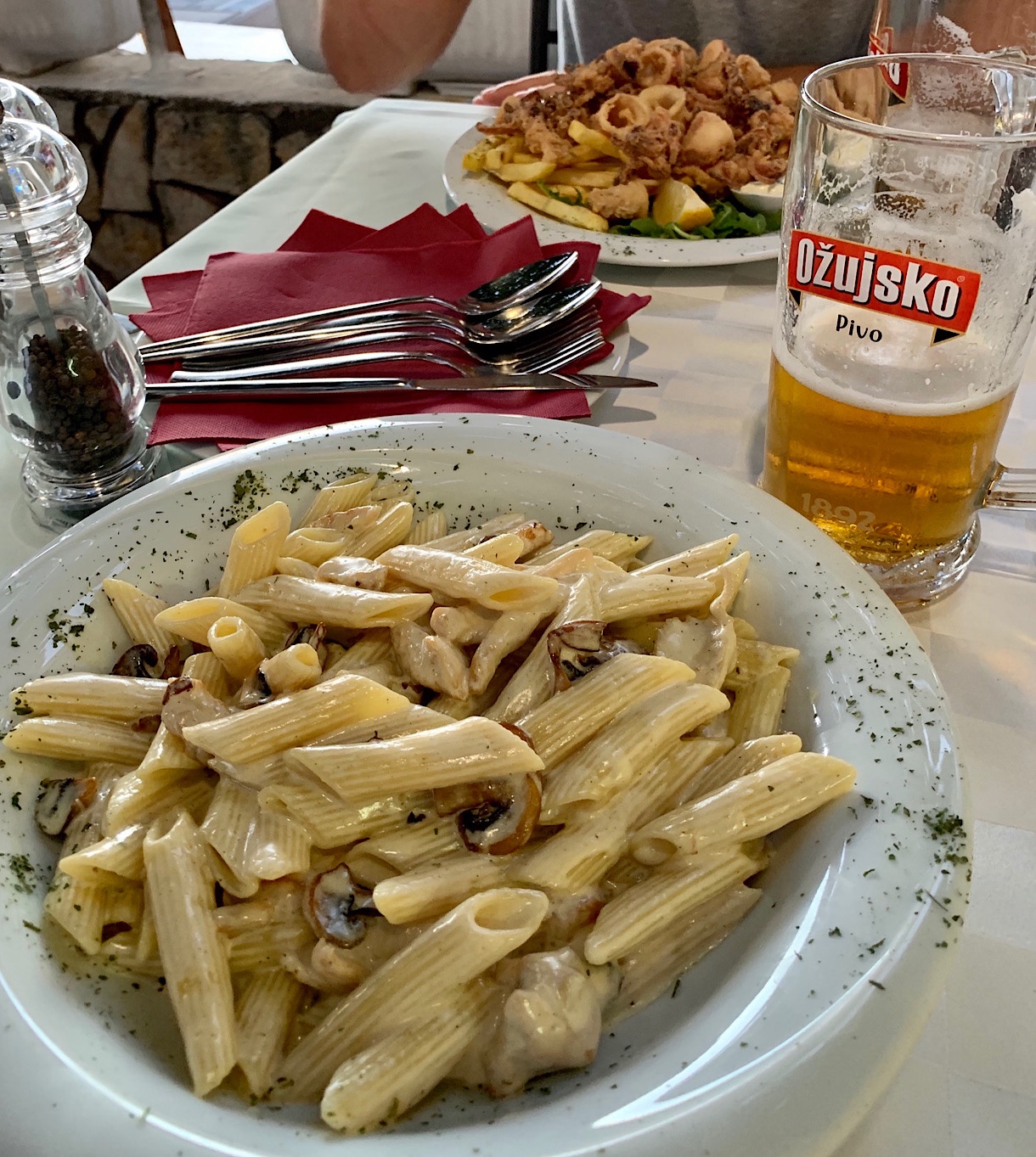 Po sześciu kilometrach spacerów po Zadarze postanowiliśmy oddalić się od ścisłego centrum celem znalezienia bezpiecznego, nie turystycznego jedzenia. Trochę dzięki Google, a trochę przez zasłyszany przy stolikach lokalny język, zajęliśmy miejsca w niezobowiązującym bistro – La Baia.