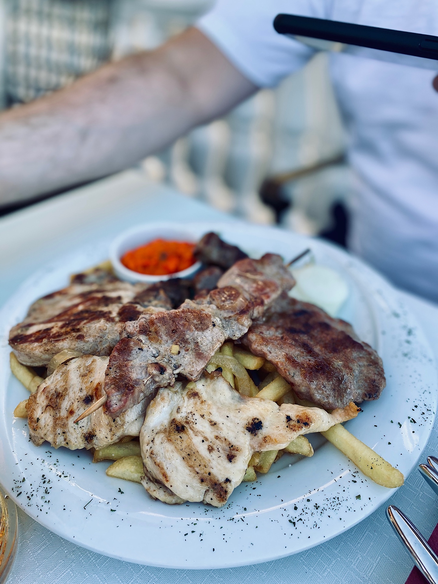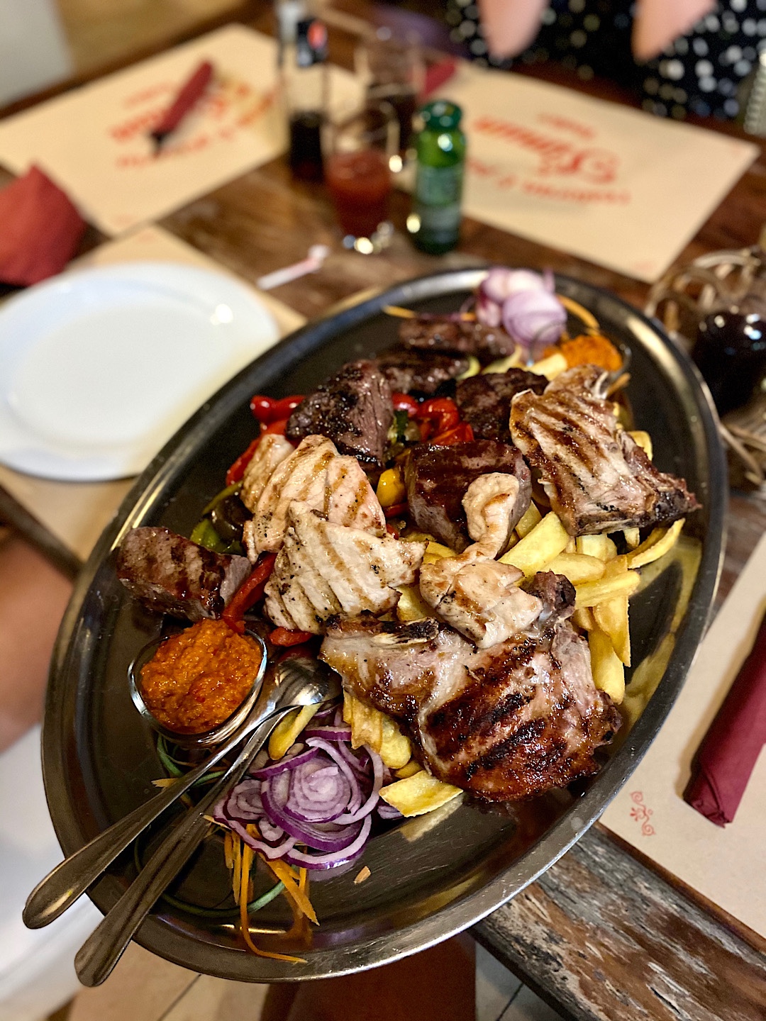 A później to niech Was już Matka Boska ma w opiece. Porcje są OGROMNE. Zamówiliśmy paterę grillową według karty dla dwóch osób oraz firmową pizzę. Kiedy pojawiły się obydwie pozycje nie mogliśmy w to uwierzyć. Pizza czterdziestka, a na paterze ponad kilogram różnego rodzaju, aromatycznych i soczystych grillowanych mięs spoczywających na kupie frytek w towarzystwie warzyw.