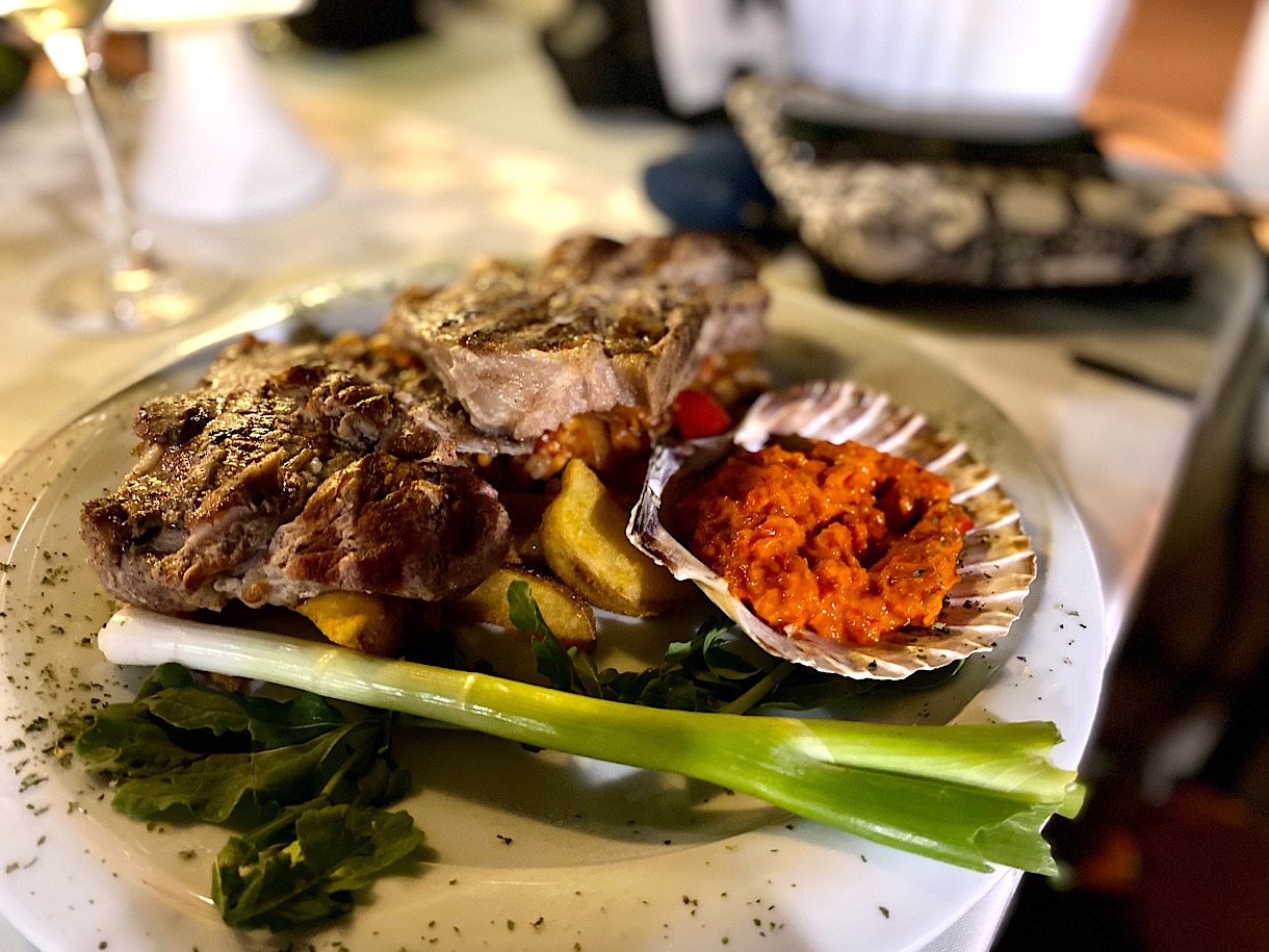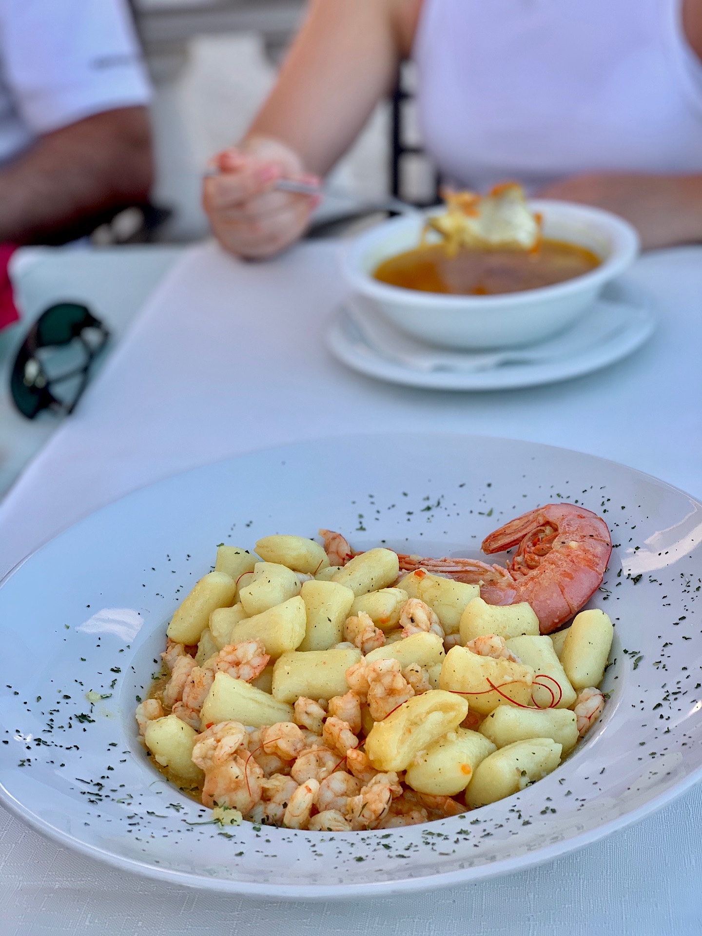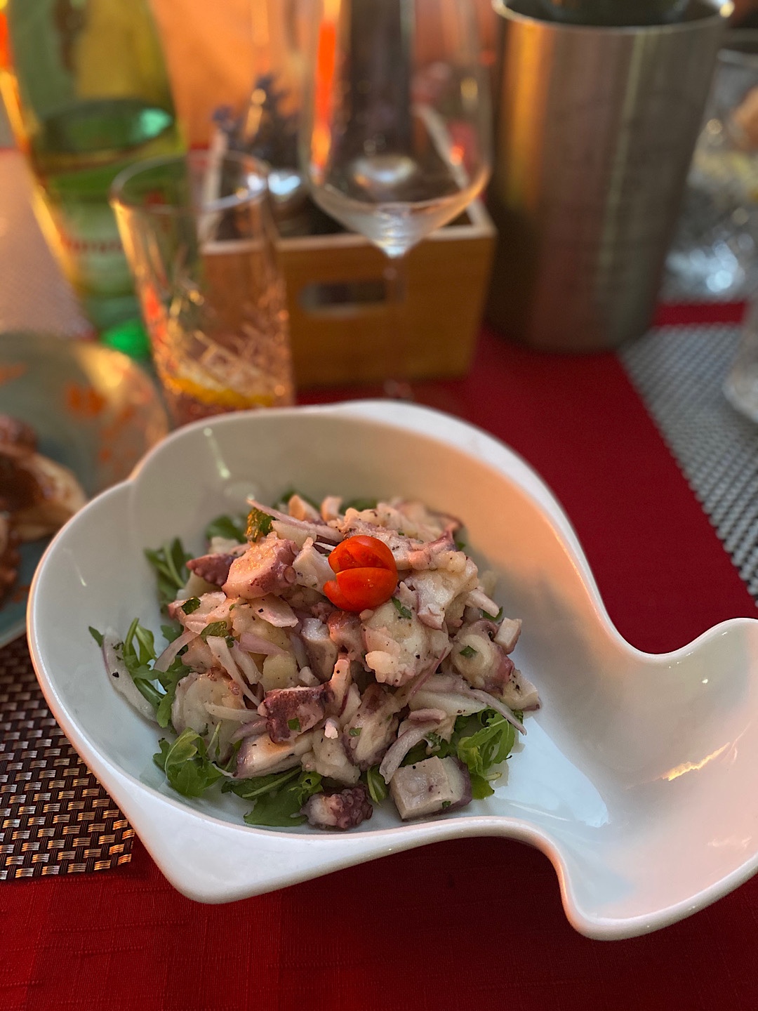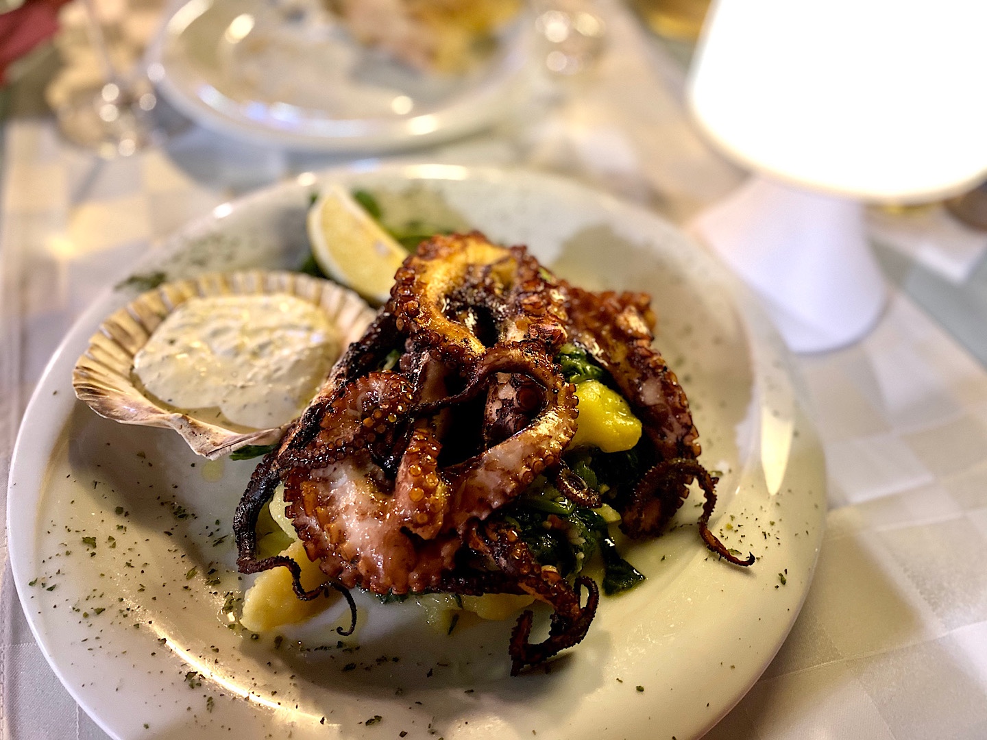 Spróbowaliśmy ośmiornicy z dalmatian chard czyli gotowanym szpinakiem i ziemniakami; sałatki z tegoż głowonoga na zimno, doskonałego risotto z krewetkami oraz tortillę z indykiem.