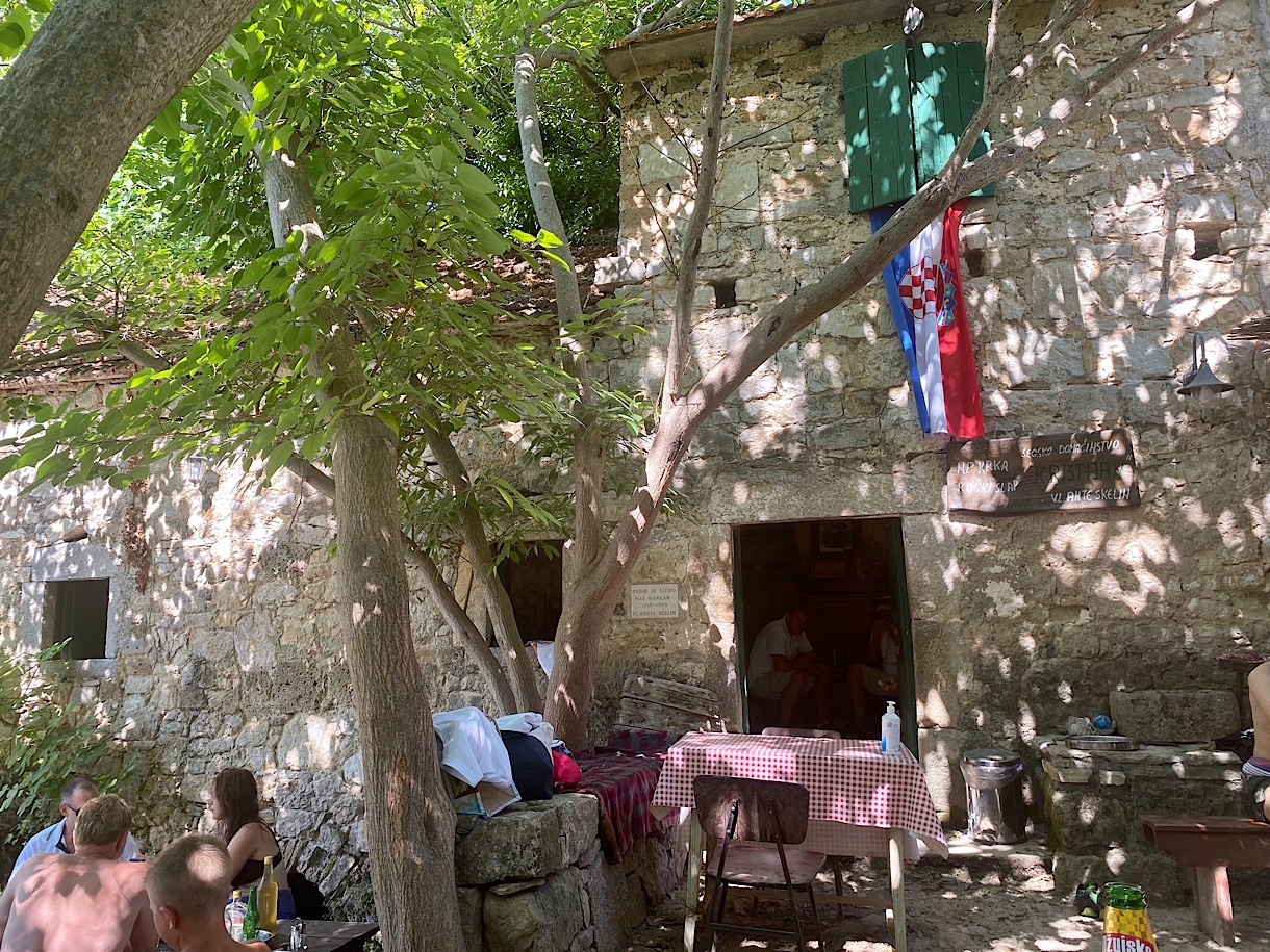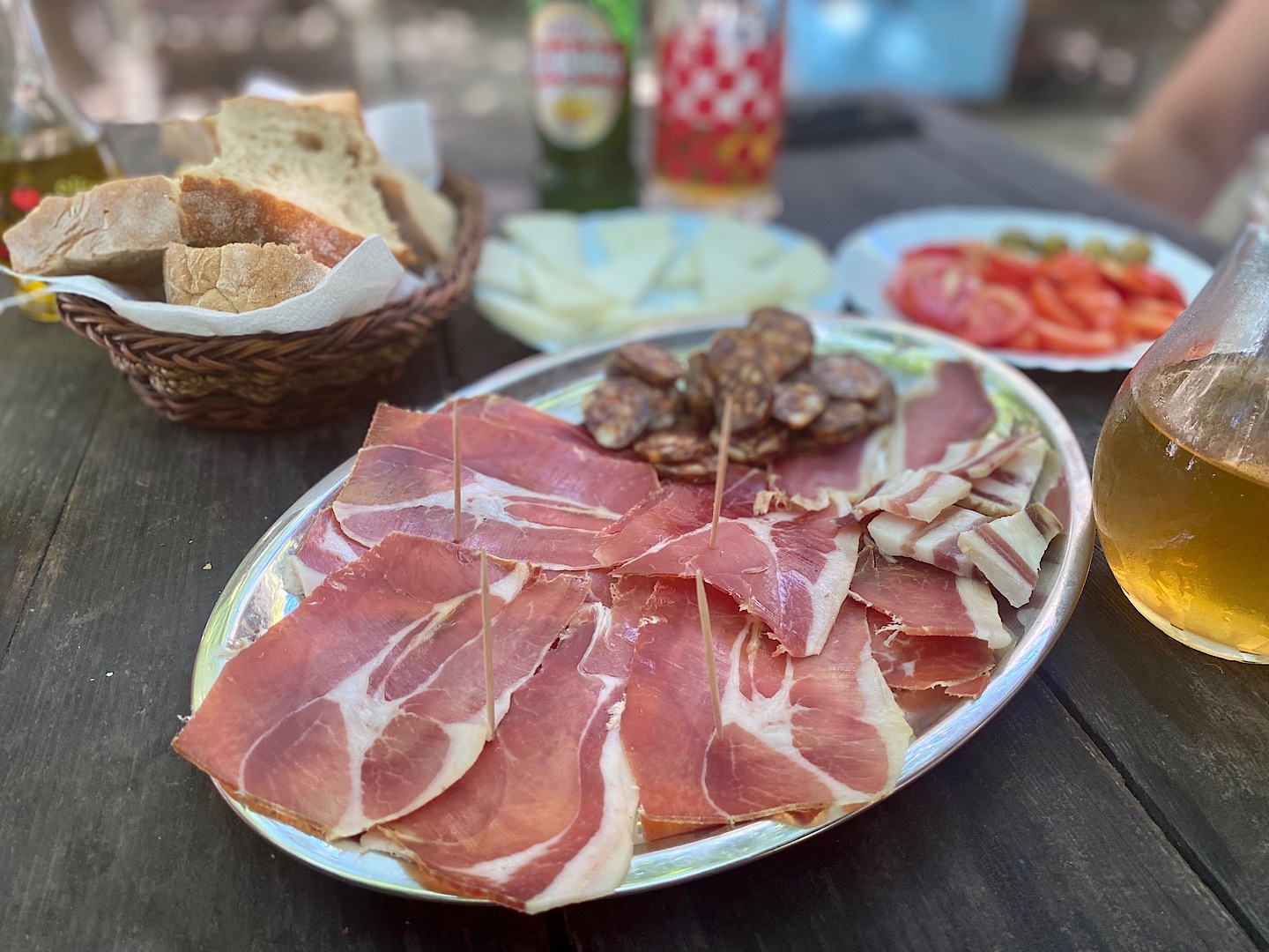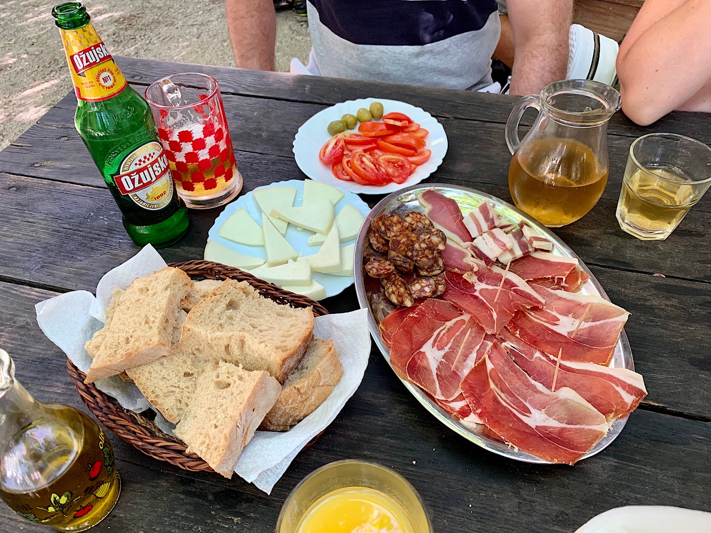 Oferta gastronomiczna jest bardzo prosta: z napitków piwo, domowe wino i softy + kawa / herbata. Do jedzenia chleb oraz patera przekąsek zawierająca lokalne prosciutto, boczek, salami i sery – taki zestaw kosztuje 60 kun. Na powyższym zdjęciu widzicie podwójną porcję. Sałatka z pomidorów i papryki to koszt 20 kun.