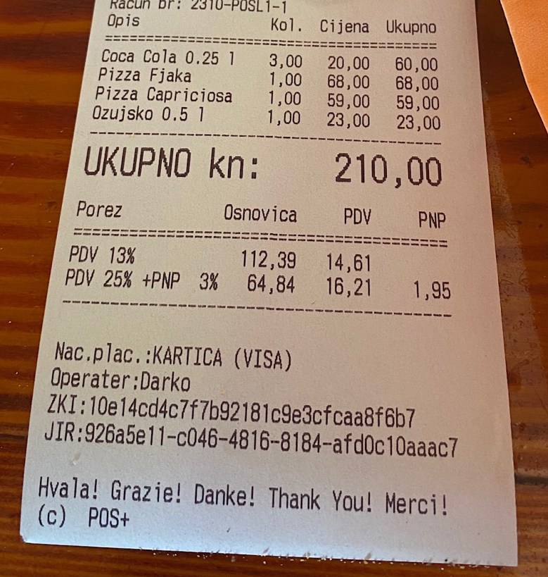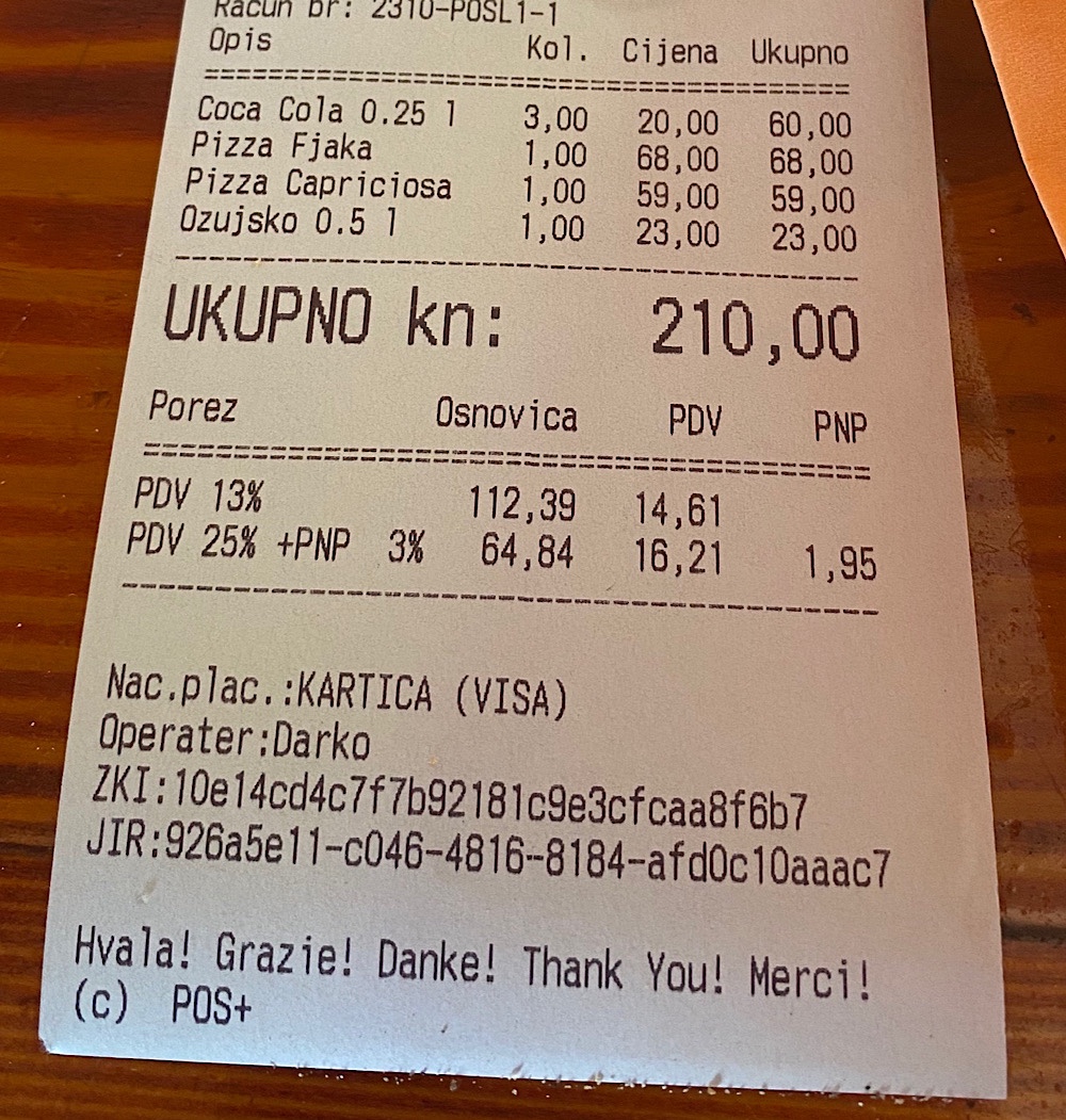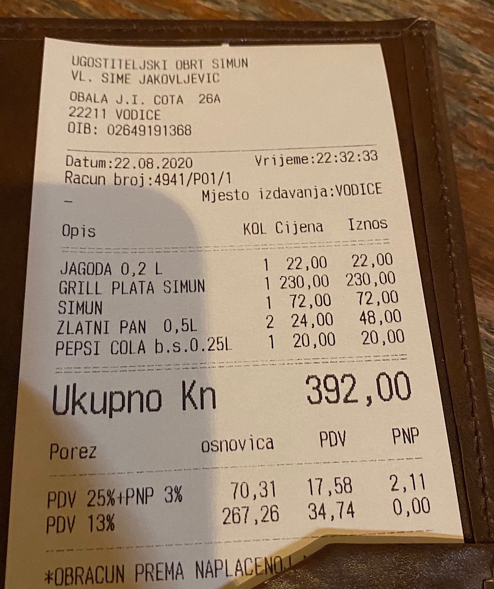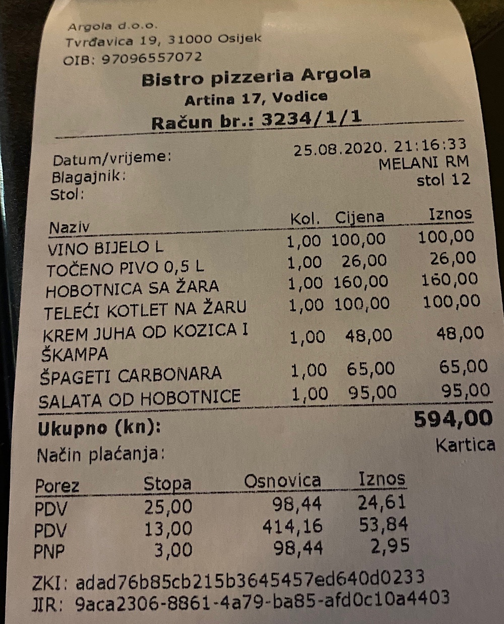 Oferta gastronomiczna jest bardzo prosta: z napitków piwo, domowe wino i softy + kawa / herbata. Do jedzenia chleb oraz patera przekąsek zawierająca lokalne prosciutto, boczek, salami i sery – taki zestaw kosztuje 60 kun. Na powyższym zdjęciu widzicie podwójną porcję. Sałatka z pomidorów i papryki to koszt 20 kun.