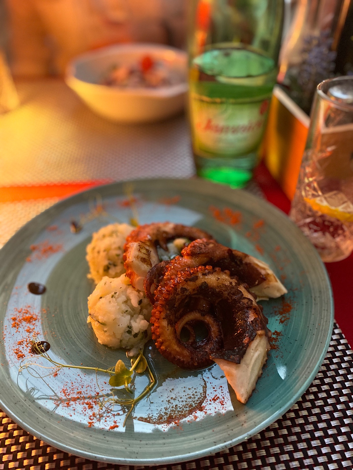 Dania podano na bardzo ładnej zastawie, brakowało im jednak podstawowych przypraw. W takim miejscu po ośmiornicy spodziewałem więcej. Niejednokrotnie w Krakowie jadłem lepsze.