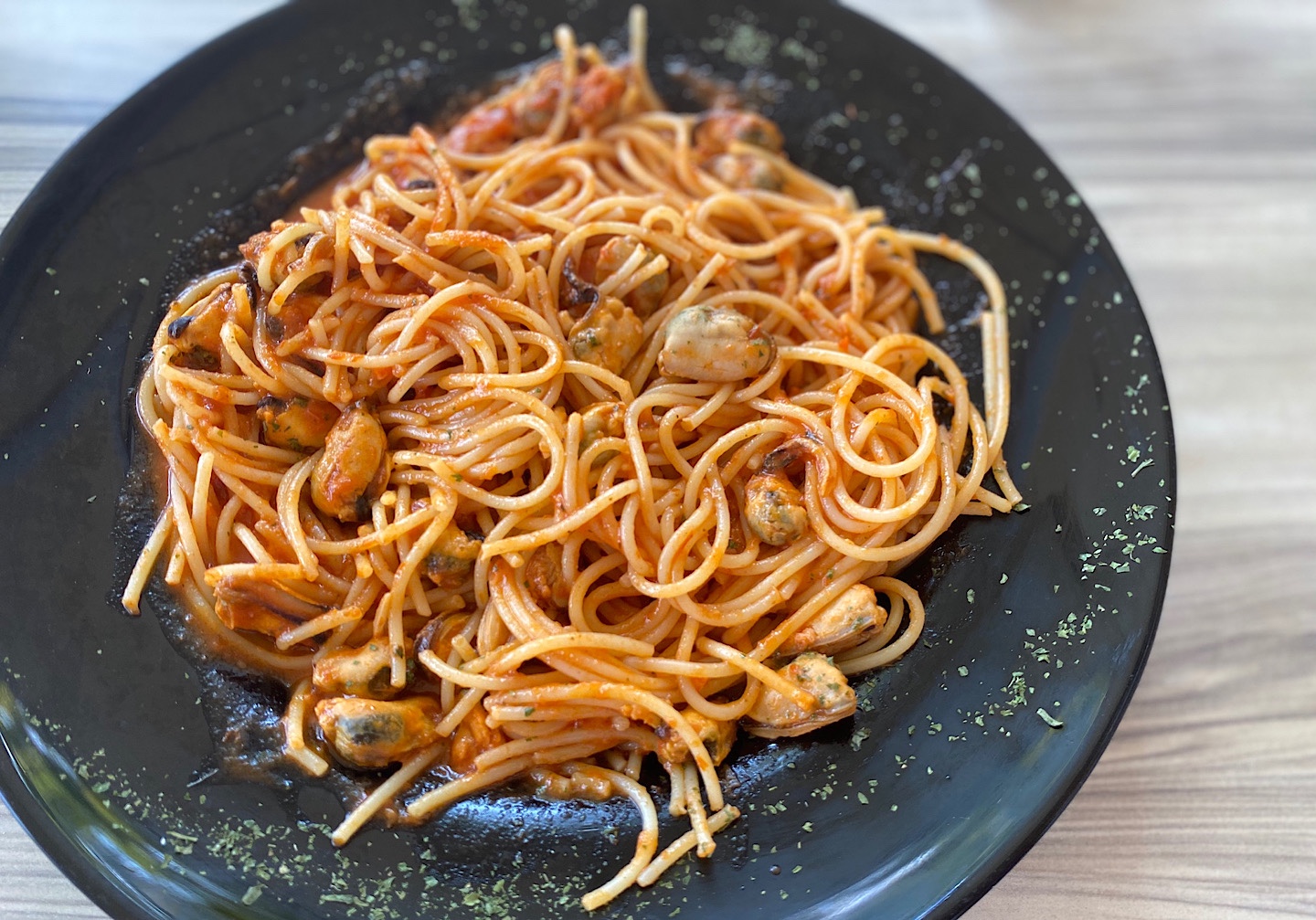 Poprosiliśmy o makaron z małżami, dwa cheeseburgery z frytkami oraz smażone kalmary i ośmiorniczki z ćwiartkami ziemniaczków.