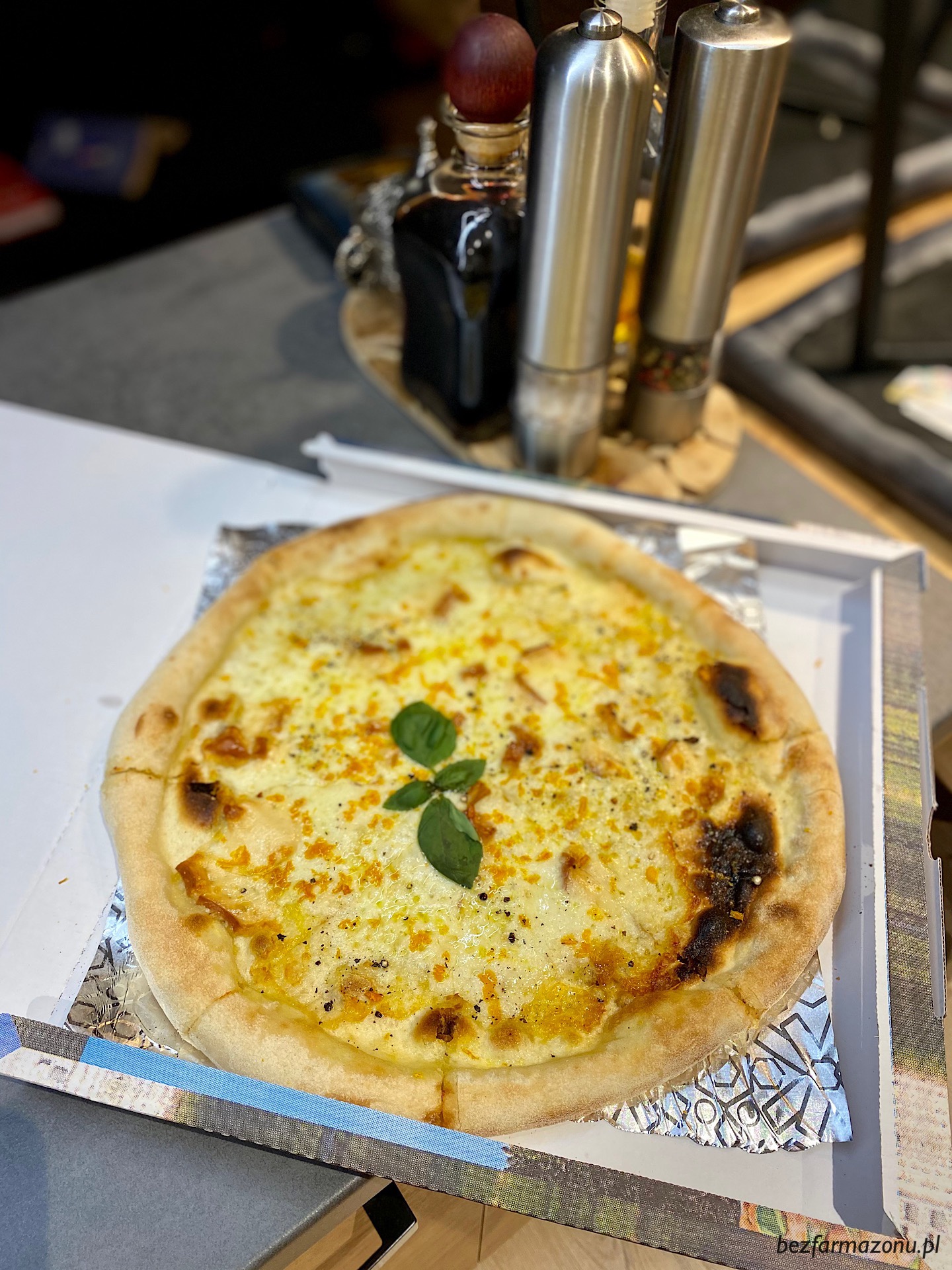 W lutym 2021 zamówiłem na odbiór osobisty pizzę na którą jeszcze kiedyś bym się nie zdobył – AFFUMICATA SICILIANA (24 PLN) z czarnym pieprzem, oliwą, mozzarellą fior di latte, wędzoną scamorzą oraz uwaga uwaga skórką z sycylijskiej pomarańczy.